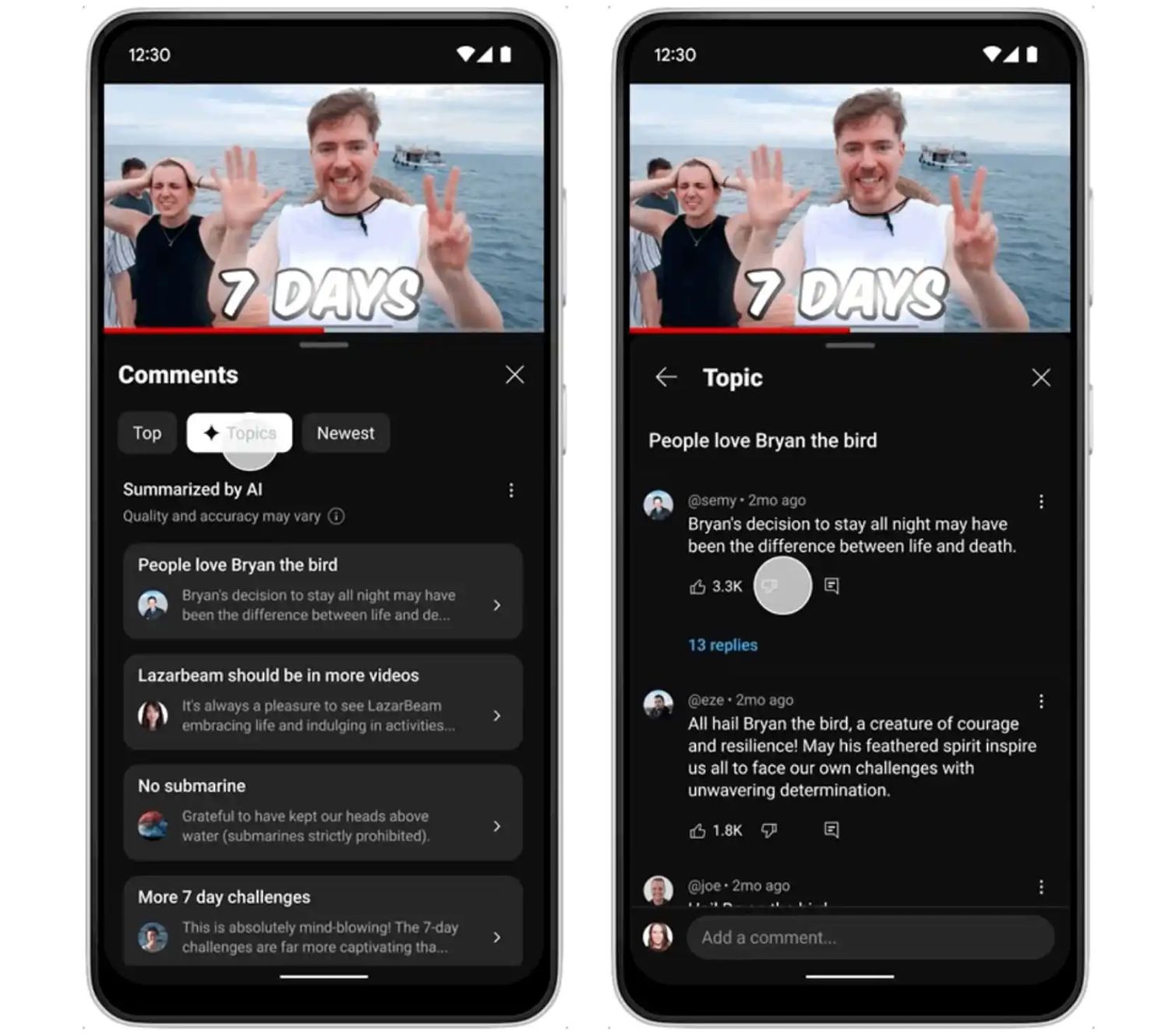 Im obigen Beispiel ist zu sehen, wie die Kommentare im „Topics“-Bereich sich auf einen Vogel beziehen, auf eine im Video gezeigte Szene oder auch auf das U-Boot. Mit dieser Zusammenfassung soll ein Meinungsbild gezeigt werden, das nach einem Tap weitere Kommentare mit ähnlichem Inhalt zeigt. Das soll es für Nutzer einfacher machen, aber auch für Creator mit sehr vielen Kommentaren die Möglichkeit geben, sich ein solches Meinungsbild zu holen. Gleichzeitig könnte es dafür sorgen, dass Spam-Kommentare deutlich weniger sichtbar werden und somit auf natürlichem Wege abnehmen.
