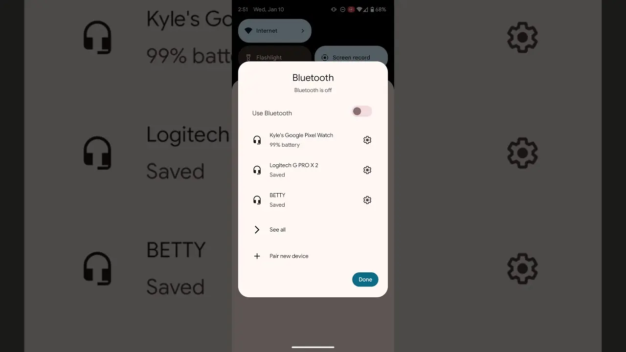 Ein Tap auf das Bluetooth-Icon in den Schnelleinstellungen öffnet das im obigen Video abgebildete Overlay. Dort findet sich am oberen Rand der Umschalter und darunter eine Auflistung von Bluetooth-Geräten in der Nähe, so wie man das aus dem vollwertigen Bluetooth-Dialog kennt. Durch dieses Overlay wird der Zugriff auf verfügbare Geräte sowie die Einstellungen beschleunigt, das reine Umschalten hingegen benötigt dann zwei Taps, statt wie bisher nur einen.