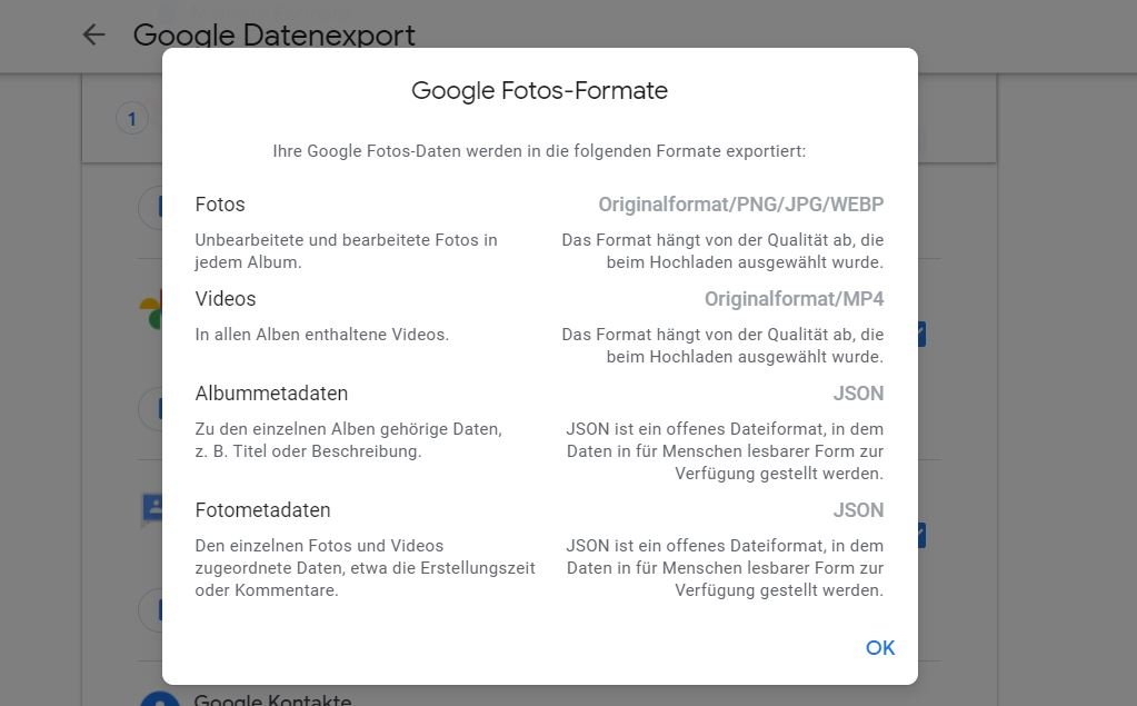 Nicht nur die Ordnerstruktur ist ein Problem, sondern auch die Einzeldateien: Ihr erhaltet jedes einzelne Bild als Bilddatei sowie zusätzlich eine JSON-Datei mit den Metadaten. Die Metadaten befinden sich zum größten Teil nicht in der Bilddatei – das gilt selbst für das Aufnahmedatum. Habt ihr euch für den Upload in Hoher Qualität entschieden, gehen sogar die Original-Dateinamen verloren. Ihr habt dann zwar alle eure Bilder wieder, aber auch ein riesiges Chaos auf eurer Festplatte oder im alternativen Cloudspeicher.