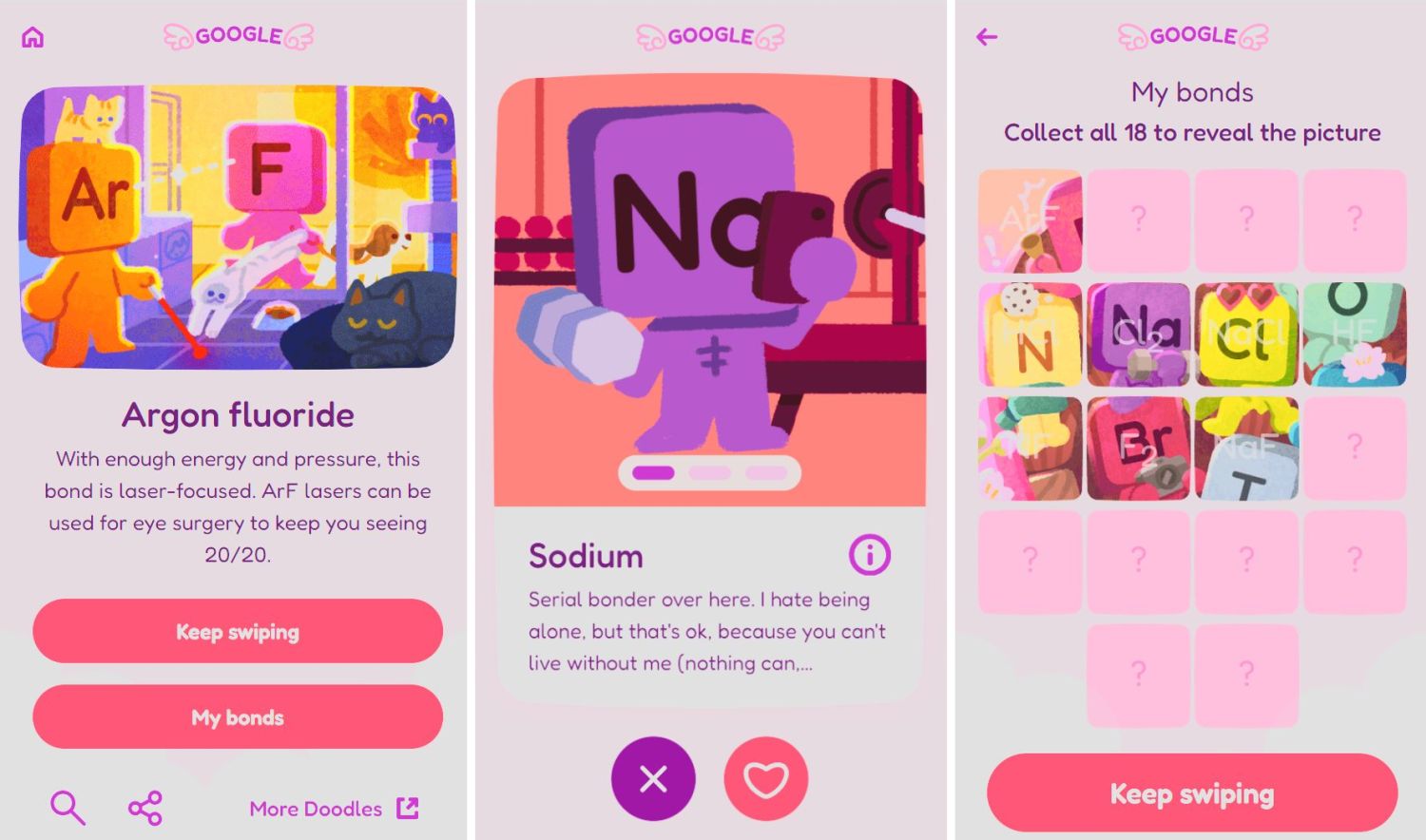 Habt ihr dieses Spielchen oft genug gespielt, ergibt sich am Ende ein Gesamtbild aus all den chemischen Elementen. Es ist sozusagen das Ziel des Spiels. Wie es entstanden ist und wie die frühen Konzeptzeichnungen aussehen, könnt ihr auf der Doodle-Seite nachsehen.