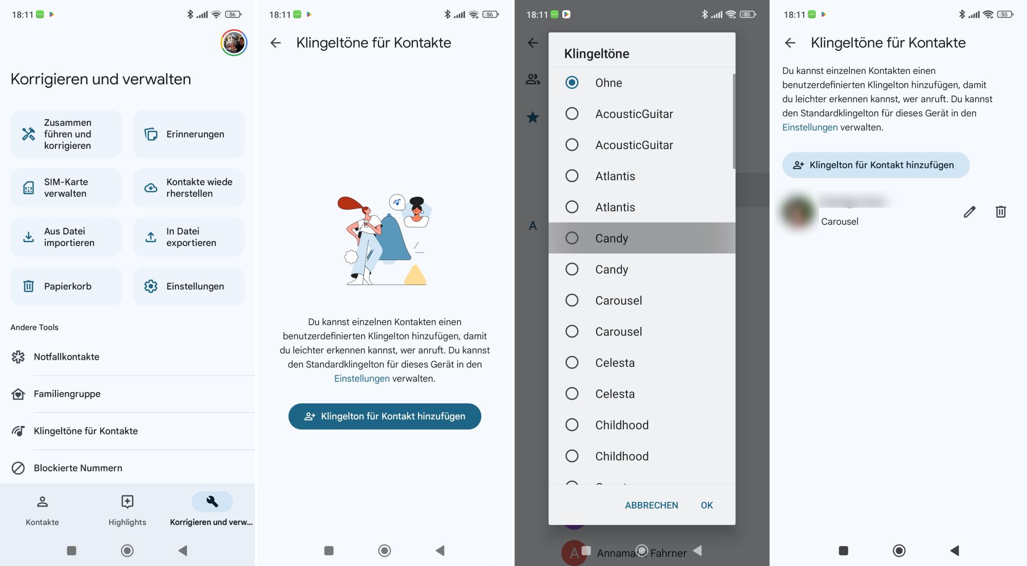 Im Bereich „Korrigieren und Verwalten“ gibt es nach dem Update den neuen Eintrag „Klingeltöne für Kontakte“. In diesem werden alle Kontakte aufgelistet, für die ein spezieller Klingelton festgelegt worden ist. Über diese Liste lässt sich die jeweilige Einstellung schnell ändern oder es lassen sich auch neue Zuordnungen anlegen. Das geht in nur zwei Schritten, denn ihr wählt einfach zuerst den Kontakt und dann den Klingelton aus – schon ist es umgestellt.