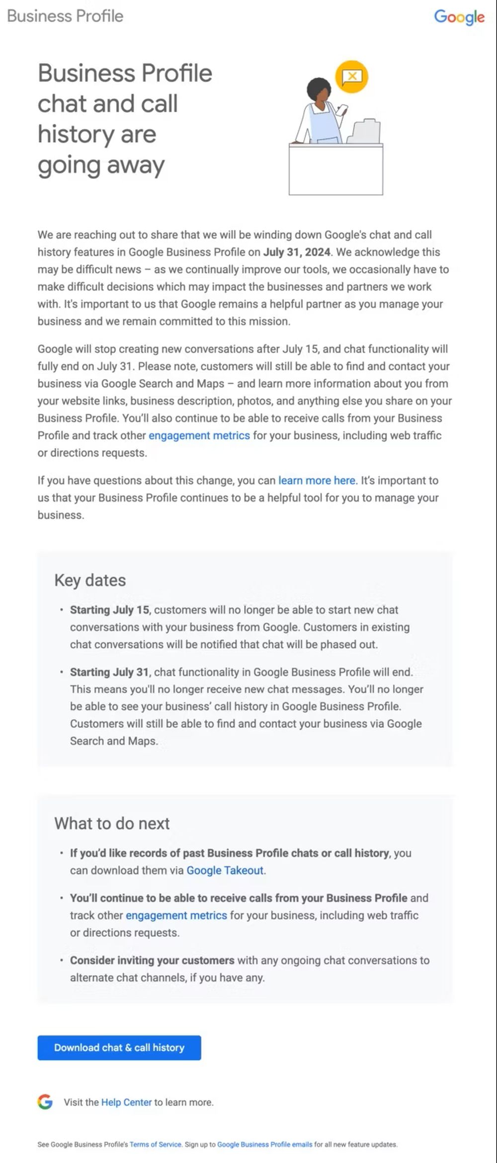Google versendet derzeit E-Mails an viele Unternehmen mit einem Business-Konto, in dem diese über eine bevorstehende Einstellung eines wichtigen Features informiert werden: Die Chatfunktion für die aus Google Maps oder der Google Websuche heraus aufrufbaren Unternehmensprofile wird bereits ab dem 15. Juli deaktiviert. Ab diesem Datum lassen sich keine neuen Konversationen mehr starten und ab dem 31. Juli sind auch Antworten auf bestehende Konversationen nicht mehr möglich. Der Download der Kundenkontakte wird noch einige Wochen länger per Takeout möglich sein.