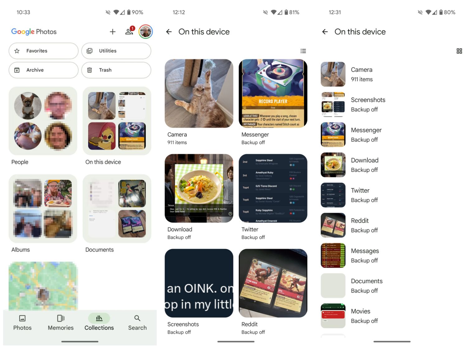 Ein Tap auf „auf diesem Gerät“ führt dann zur Galerie-Ansicht mit allen lokal verfügbaren Medien, so wie man das aus allen anderen Galerie-Apps kennt. Das bedeutet, dass es jetzt zwei Taps benötigt, um zu dieser Galerie zu gelangen. Im letzten Testlauf hatte man diese lokalen Alben noch als Karussell am oberen Rand gezeigt, was je nach Anzahl der Ordner sinnvoll oder weniger hilfreich gewesen sein könnte.