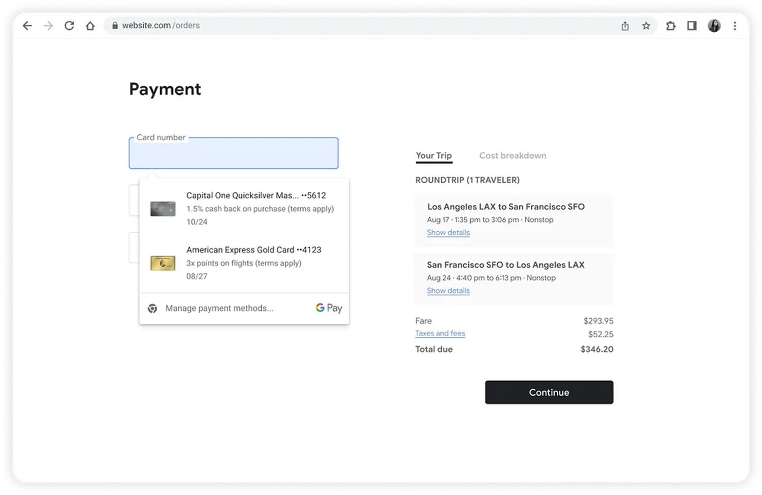In der Browserversion von Google Pay für Android ist es jetzt nicht mehr notwendig, für das automatische Ausfüllen der Kreditkarten die Sicherheitsnummer (CVC) einzugeben, die man sowieso immer wieder vergisst. Stattdessen lässt sich jetzt die biometrische Entsperrung des Smartphones verwenden. Also einfach den Fingerabdruckscanner nutzen und schon werden alle Felder vom Namen über die Kreditkartennummer bis zum Ablaufdatum automatisch ausgefüllt.