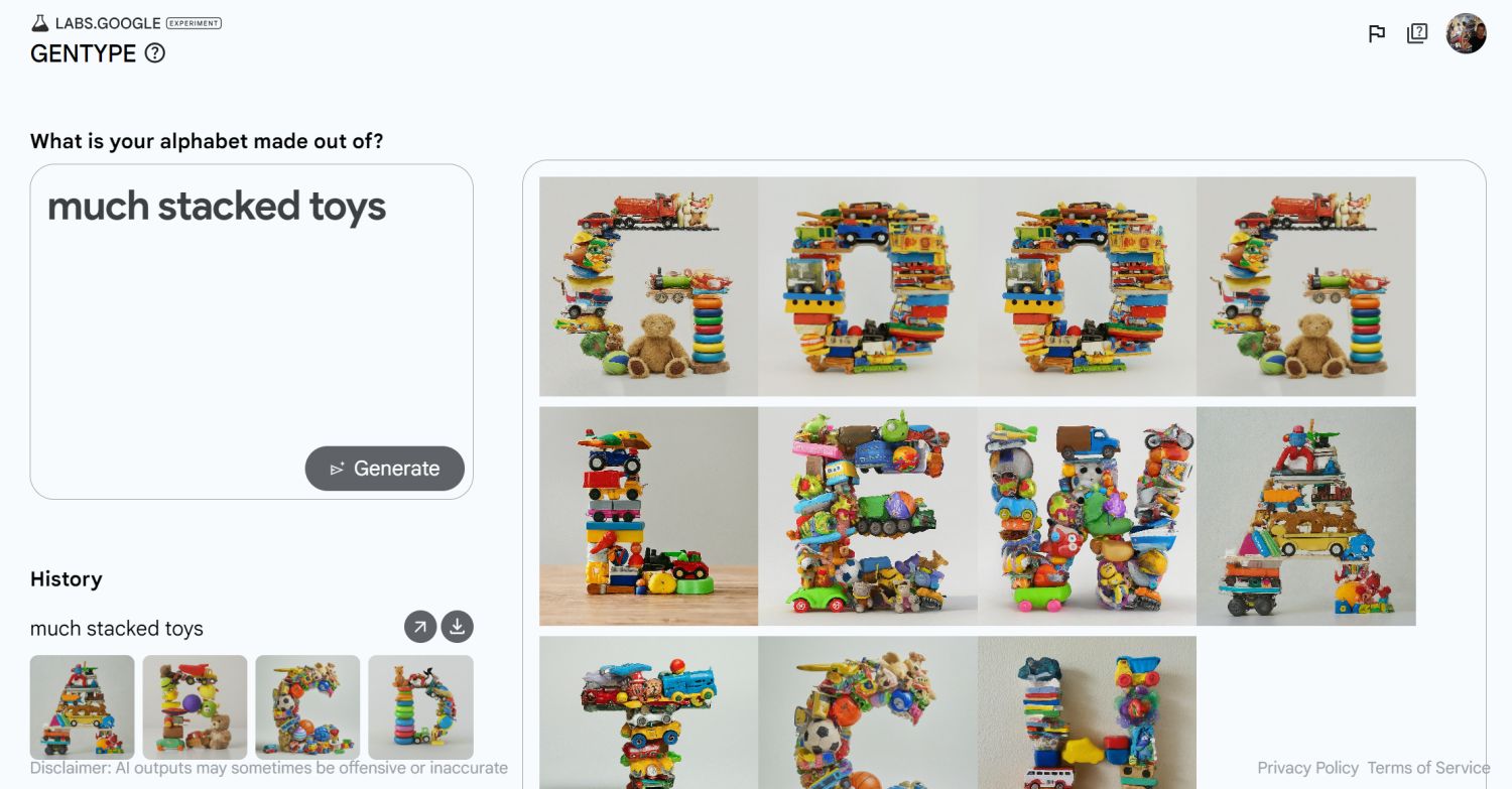 Google hat den neuen Bildgenerator GenType vorgestellt. Dabei handelt es sich um einen sehr zielgerichteten Bildgenerator, der lediglich die 26 Buchstaben des Alphabets erstellen kann. Im Prompt kann der Stil vorgegeben werden, aus dem die Buchstaben erstellt werden sollen, wobei auch die üblichen längeren Beschreibungen zum Einsatz kommen können. Aber auch mit einigen wenigen Stichwörtern kommt ihr zum Ziel.