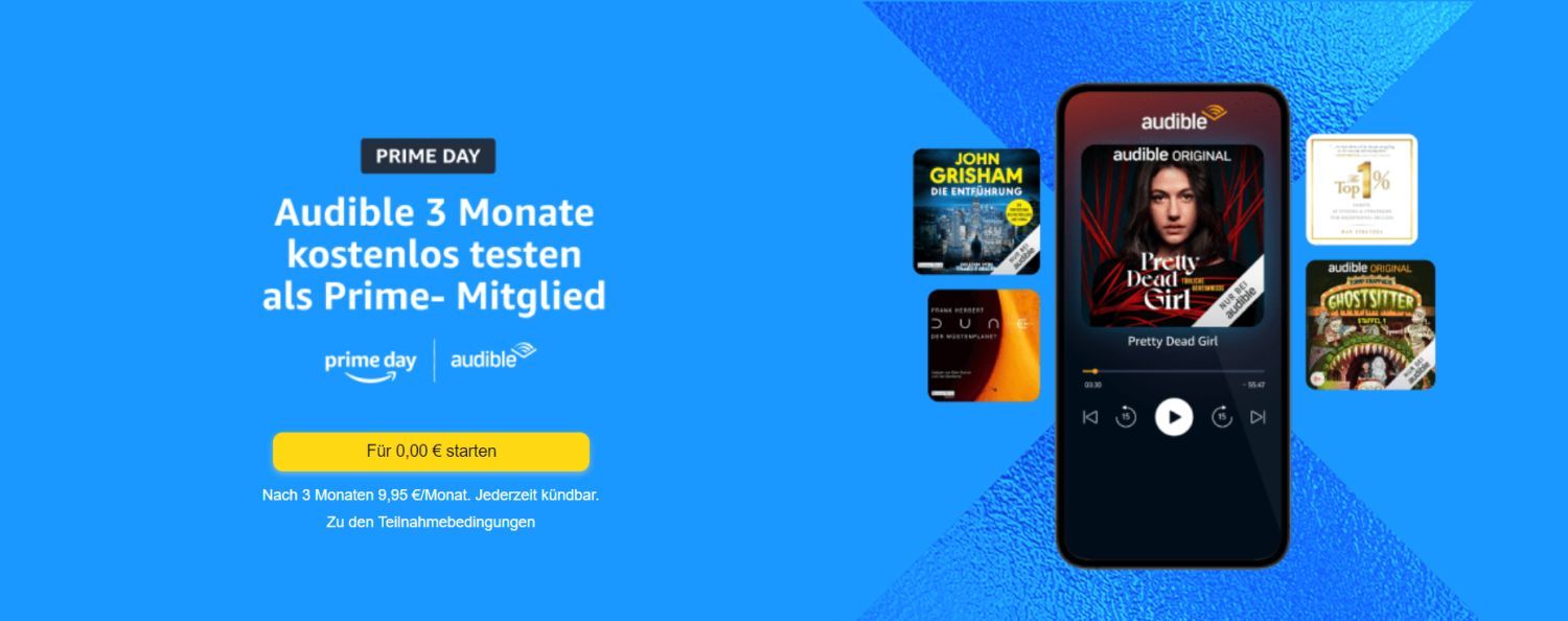 Nach Ablauf des Aktionszeitraums von 3 Monaten kostet das Audible Abo 9,95€/Monat.Das Angebot gilt nur für Prime Mitgliedschaften Neukunden in Deutschland, Österreich und der Schweiz die das Angebot über amazon.de abschließen, sowie für Kunden, die in den vergangenen sechs Monate kein Audible-Abo hatten.