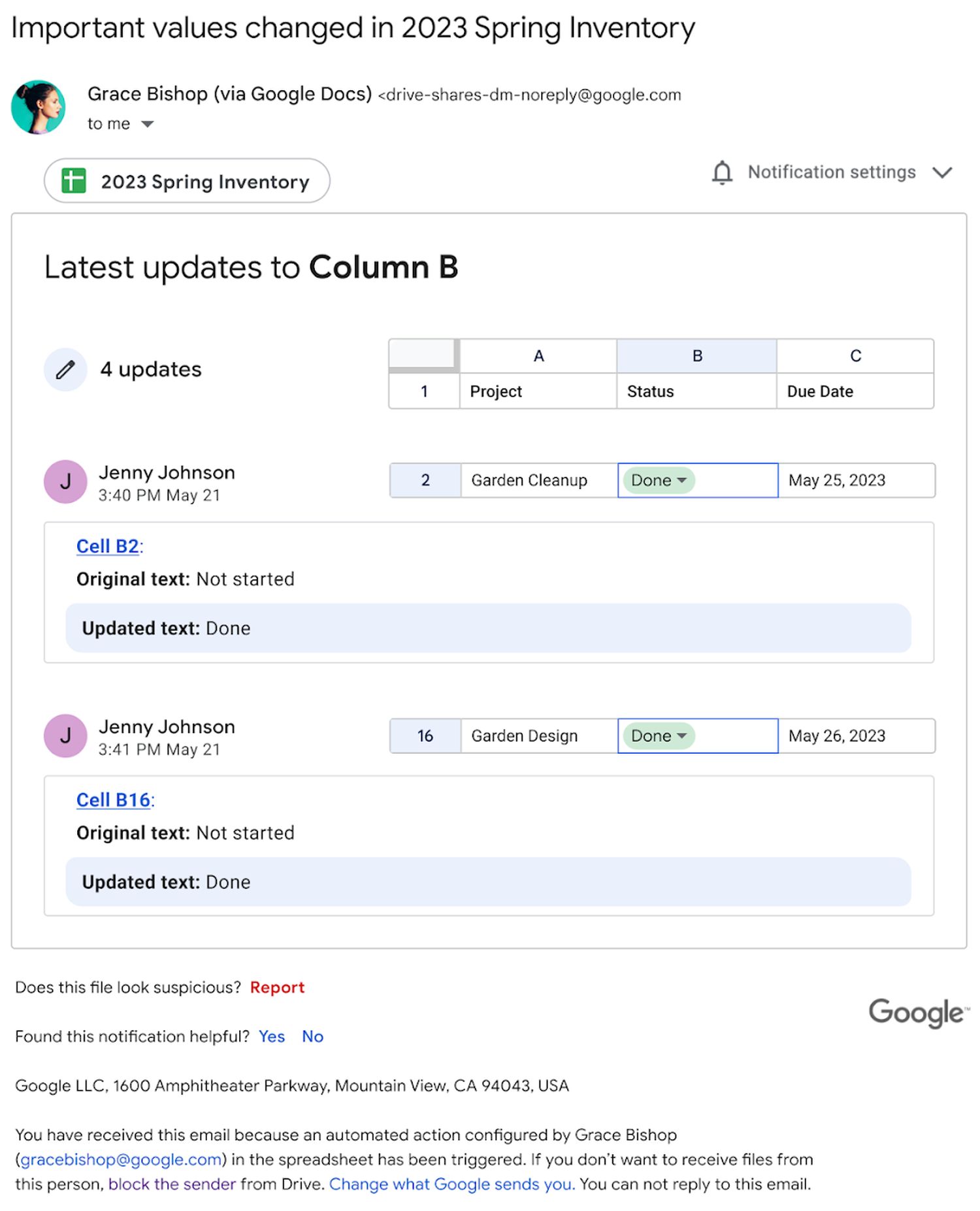 Google Sheets erhält innerhalb des Workspace-Pakets ein Update, das es den Nutzern deutlich erleichtern soll, über Änderungen an geteilten Tabellen informiert zu bleiben. Denn statt wie bisher lediglich eine Bearbeitung jeglicher Form aufgelistet zu bekommen, kann man sich mit den „Conditional Notifications“ nun auch innerhalb der App als auch per E-Mail informieren lassen, wenn eine bestimmte Änderung vorgenommen worden ist. Auf folgendem Screenshot ist das zu sehen: