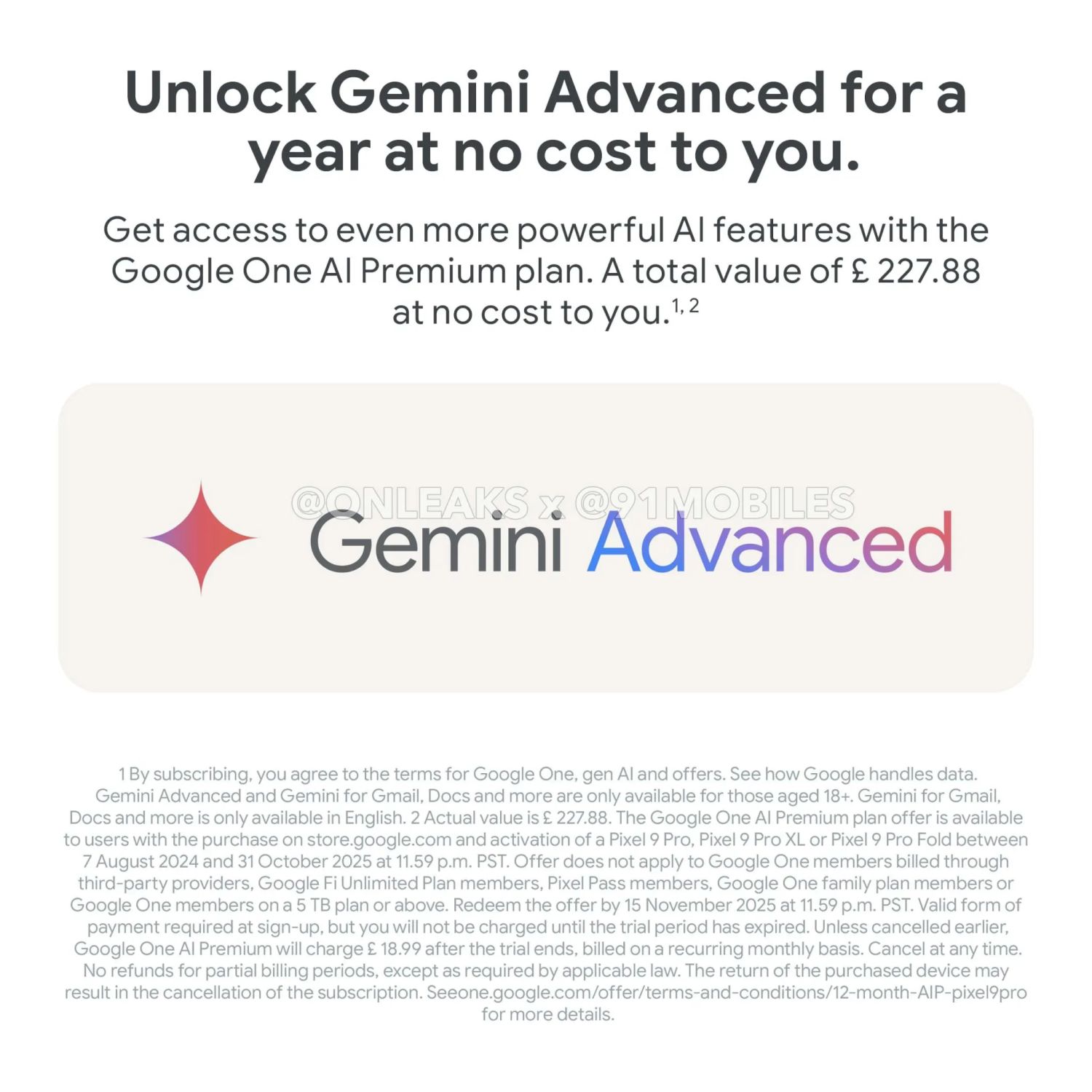 Damit sind wir wieder beim erwarteten Pixel-Sprachassistenten Pixie, der seine Schatten längst vorausgeworfen hat. Es soll sich dabei um eine Art Kombination aus dem Google Assistant und Gemini handeln, der exklusiv für die Pixel-Smartphones angeboten werden soll. Um diesen in vollem Umfang nutzen zu können, dürfte ein Abo Voraussetzung sein. Obiger Marketing-Leak verrät uns, dass die 12 Monate Gemini Advanced für alle Pixel 9 Pro-Smartphones gelten, während vom normalen Gerät keine Rede ist. Es ist wahrscheinlich, dass auch das Pixel 9 einen solchen Vorteil erhalten wird, wenn auch etwas kürzer (siehe weiter oben).