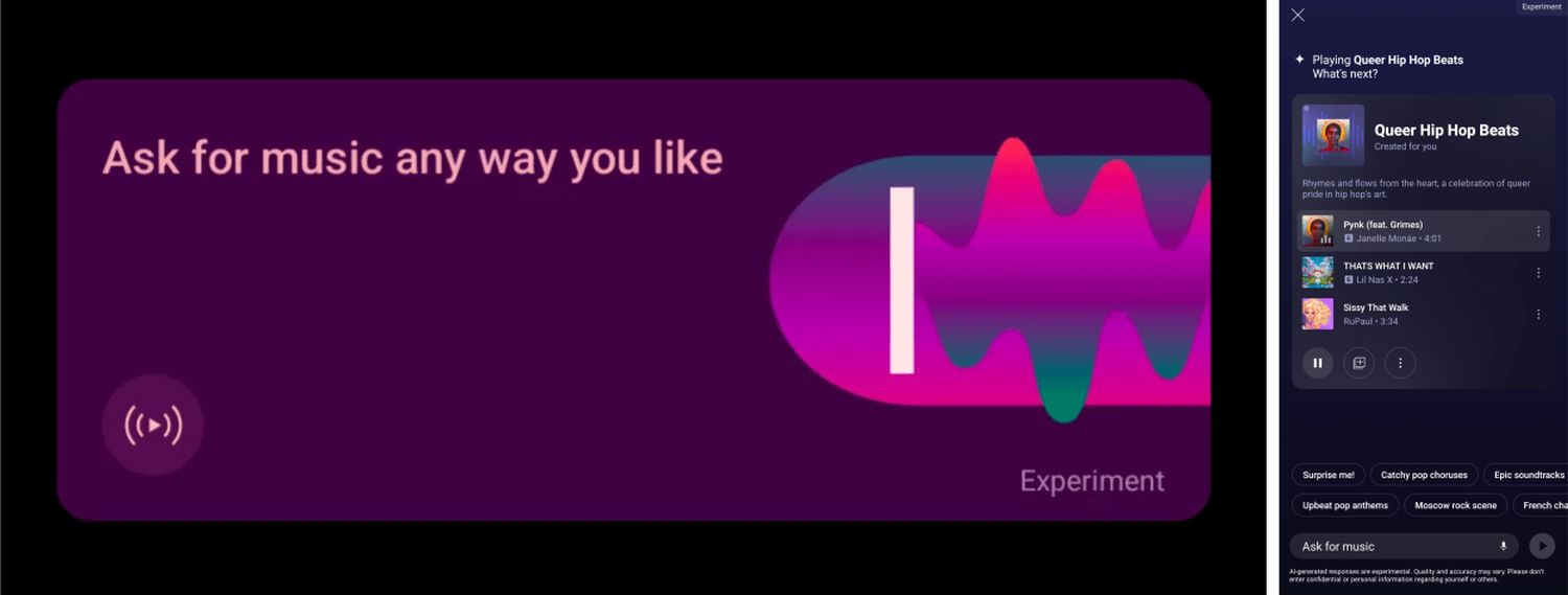 Bei ersten Nutzern taucht eine neue Infokarte auf der Startseite auf, die mit einem Tap zu einem Prompt führt. Dort kann per Sprache oder in Textform sehr genau eingegeben werden, welche Musik man gerne hätte. KI-typisch kann der Prompt sehr kurz oder bei Bedarf natürlich auch sehr lang und detailliert sein. Direkt nach der Eingabe gibt es eine Vorschau und mit einem weiteren Tap wird eine auf diesen Wünschen basierende Playliste erstellt.