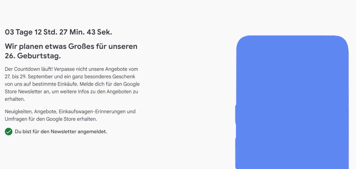 In dieser Woche feiert Google den 26. Geburtstag, den man sicherlich wieder mit einigen Aktivitäten zelebrieren wird – und auch in diesem Jahr wird sich der deutsche Google Store daran beteiligen. Jetzt hat man für Donnerstag „ganz Besondere“ Aktionen angekündigt und bereits einen Countdown gestartet. Es sind starke Aktionen rund um die Pixel-Smartphones, das Pixel Tablet und die Pixel Watch zu erwarten.