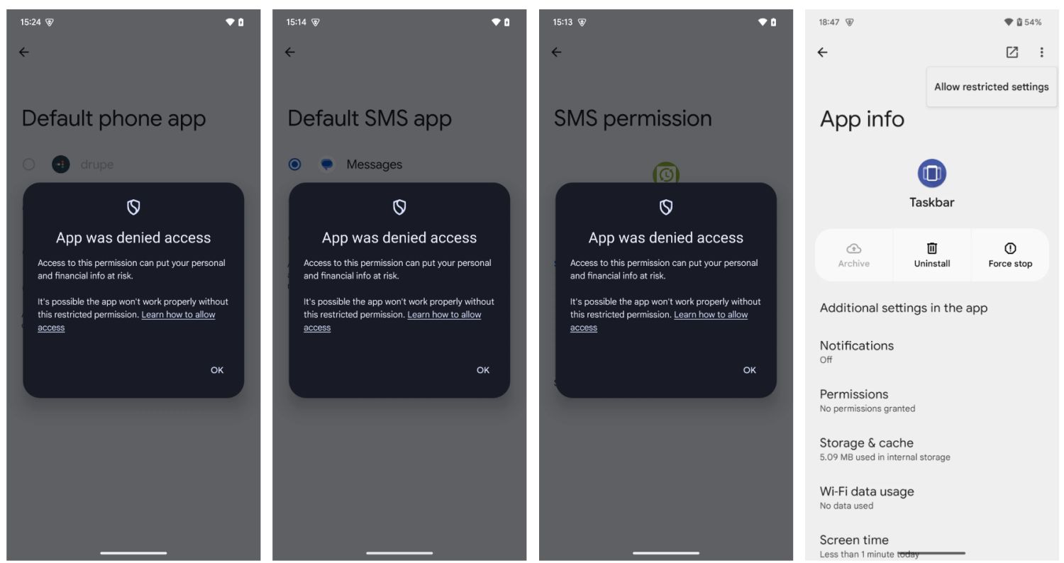Zu den eingeschränkten Berechtigungen gehören der Zugriff auf die Telefonfunktion, auf SMS, das Einstellen als Standard-SMS-App, der Zugriff auf Benachrichtigungen, auf die Accessibility-Features sowie das Zeichnen über andere Apps und der Zugriff auf Nutzeraktivitäten.