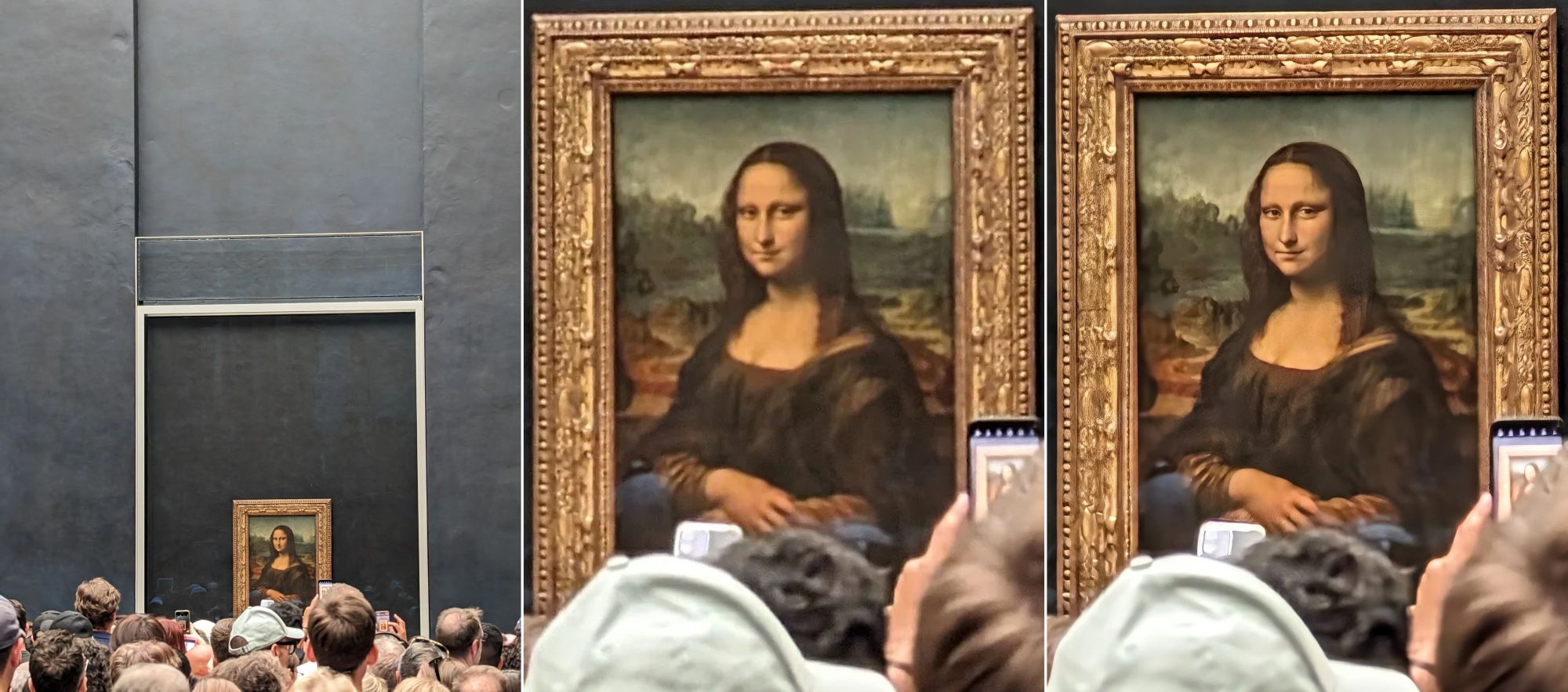 Zoom Enhance ist ein Offline-Feature, das die lokal auf den Pixel 9 Pro-Smartphones vorhandene Gemini Nano-KI nutzt, um weitere Details aus den Bildern herauszukitzeln. Es funktioniert mit beliebigen Fotos, sodass ihr auch alte Aufnahmen vielleicht noch einmal ganz neu entdecken könnt. Natürlich kann die KI nicht zaubern und keine Dinge zeigen, die nicht vorhanden wären (dafür gibt es den Magic Editor), aber der Detailgrad ist schon erstaunlich – vergleicht nur einmal die folgenden Mona Lisa-Zooms. Links das Original-Foto hinter der langen Warteschlange, in der Mitte die normale Vergrößerung und rechts die KI-Unterstützung.