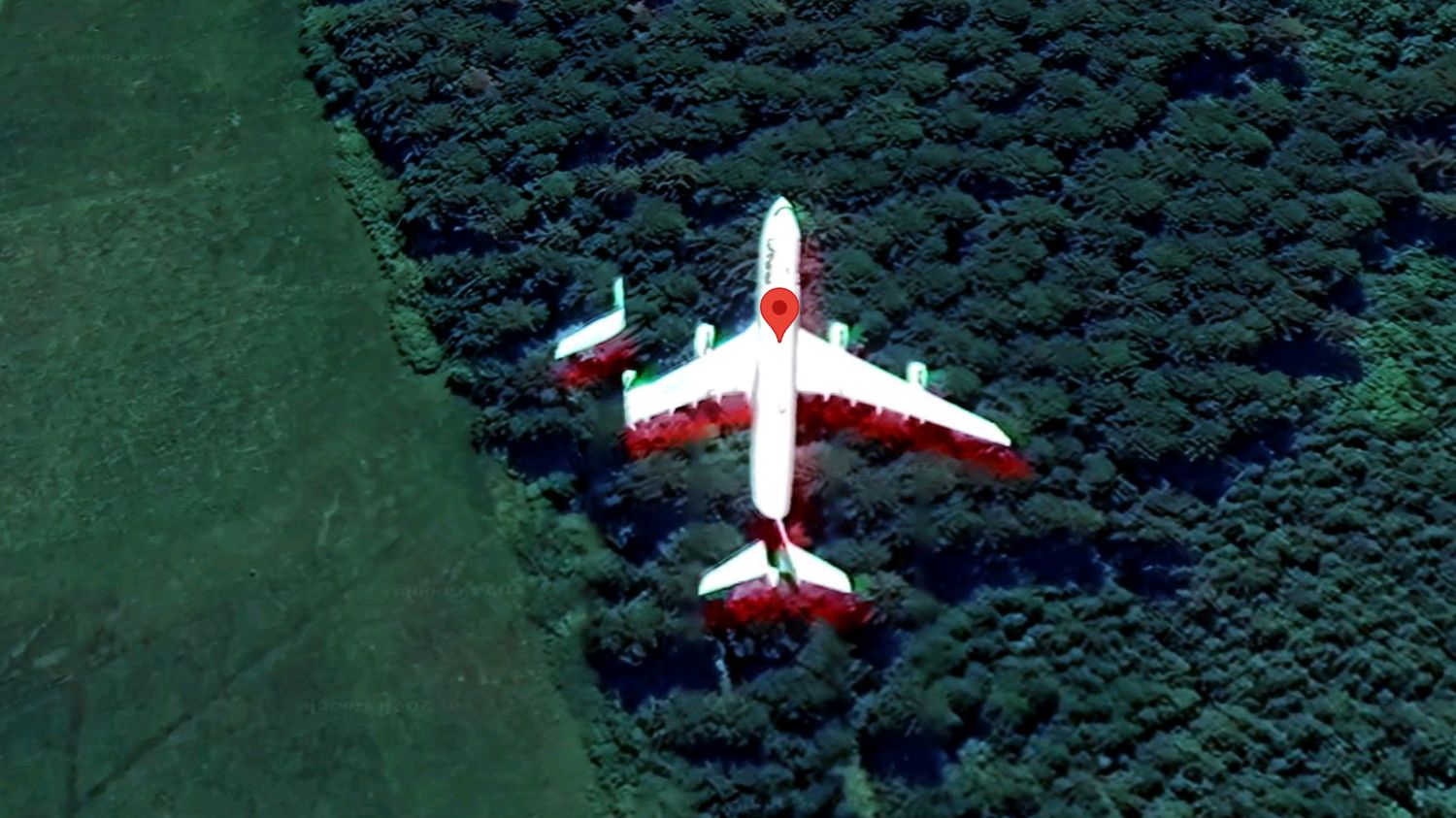 Auf der Aufnahme ist recht deutlich zu erkennen, dass die Bruchkante vollkommen gerade verläuft. Die Google Maps-Satellitenaufnahmen bestehen aus unzähligen Einzelaufnahmen, die von der Kartenplattform zusammengefügt werden – und genau an der Stelle des Flugzeugs verläuft eine Grenze. Die Aufnahmen sind zwar korrekt zusammengefügt, aber da die Rohbilder nacheinander aufgenommen wurden, kam es zwischen den beiden Bildern zu einer minimalen Verzögerung. Bei der Geschwindigkeit eines Verkehrsflugzeugs reicht das aus, um ein solches Ergebnis zu erhalten.