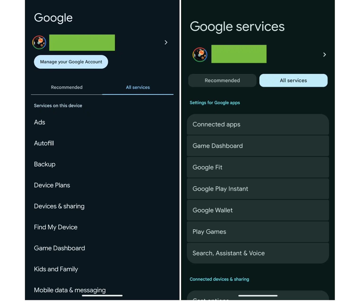 Erst auf den zweiten Blick fällt auf, dass die Einstellungen nun „Google services“ und nicht mehr „Google“ heißen. Das ist eher Formsache, aber sicherlich die korrektere Variante. Die Verknüpfung zu den Kontoeinstellungen bleibt erhalten, der Button für das Managen des Google-Kontos fällt weg und wird in das Menü für die Kontoauswahl verschoben.