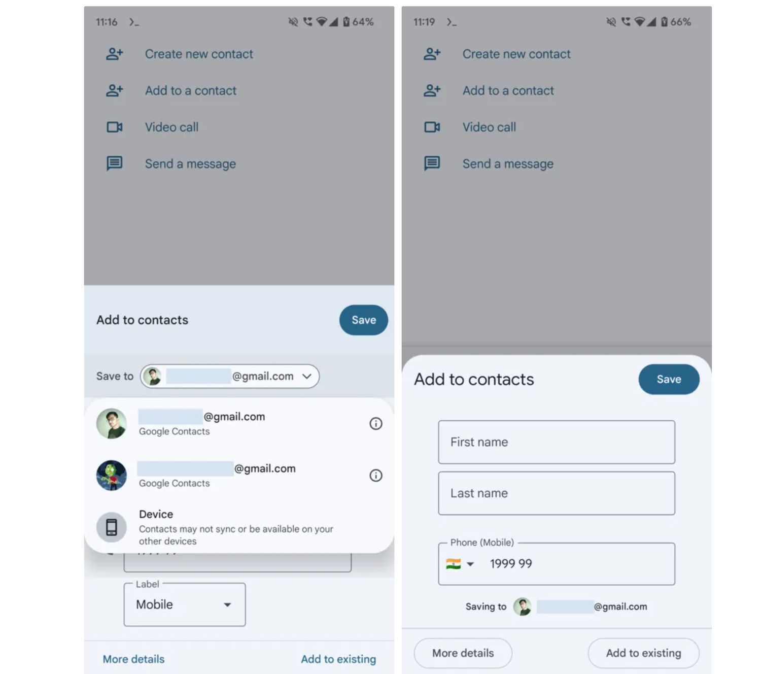 Wie ihr auf dem rechten Screenshot sehen könnt, ist die Auswahl des Speicherortes verschwunden. Standardmäßig wird das aktiv genutzte Google-Konto verwendet. Damit haben Nutzer weder die Möglichkeit, ein alternatives Google-Konto zum Ablegen des Kontakts auszuwählen, noch die Offline-Variante zu verwenden. Wer die neu angelegte Person in ein anderes Google-Konto verschieben möchte, kann das nach wie vor in den erweiterten Einstellungen tun, doch beim Anlegen fällt die Möglichkeit weg.