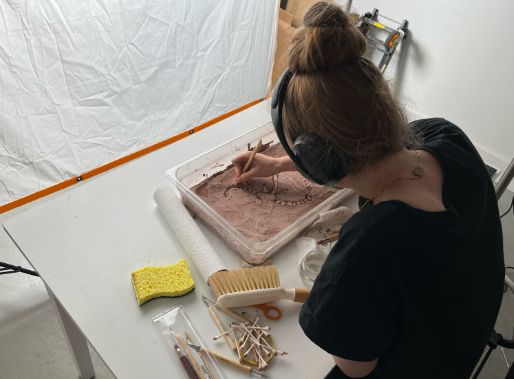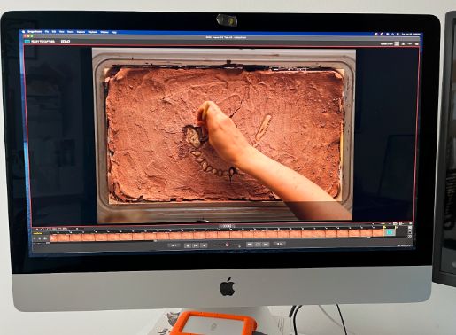 Der Google-Schriftzug ist aus Ton gefertigt und dürfte wohl recht aufwendig gewesen sein. Dennoch wird es von einigen Kritzeleien überlagert, die die Interaktivität in das Doodle bringen: Wir sehen einen gezeichneten Staurikosaurus sowie einen Pickel, mit dem dessen Skelett vorsichtig ausgegraben wird. Symbolisiert wird das durch einen Knochen, neben dem vorsichtig gehämmert wird. Der Staurikosaurus selbst hält noch einen Play-Button in der Hand, mit dem sich eine siebenseitige Slideshow über die Ausgrabung starten lässt. Auch die dortigen Motive sind von Hand gefertigt.
