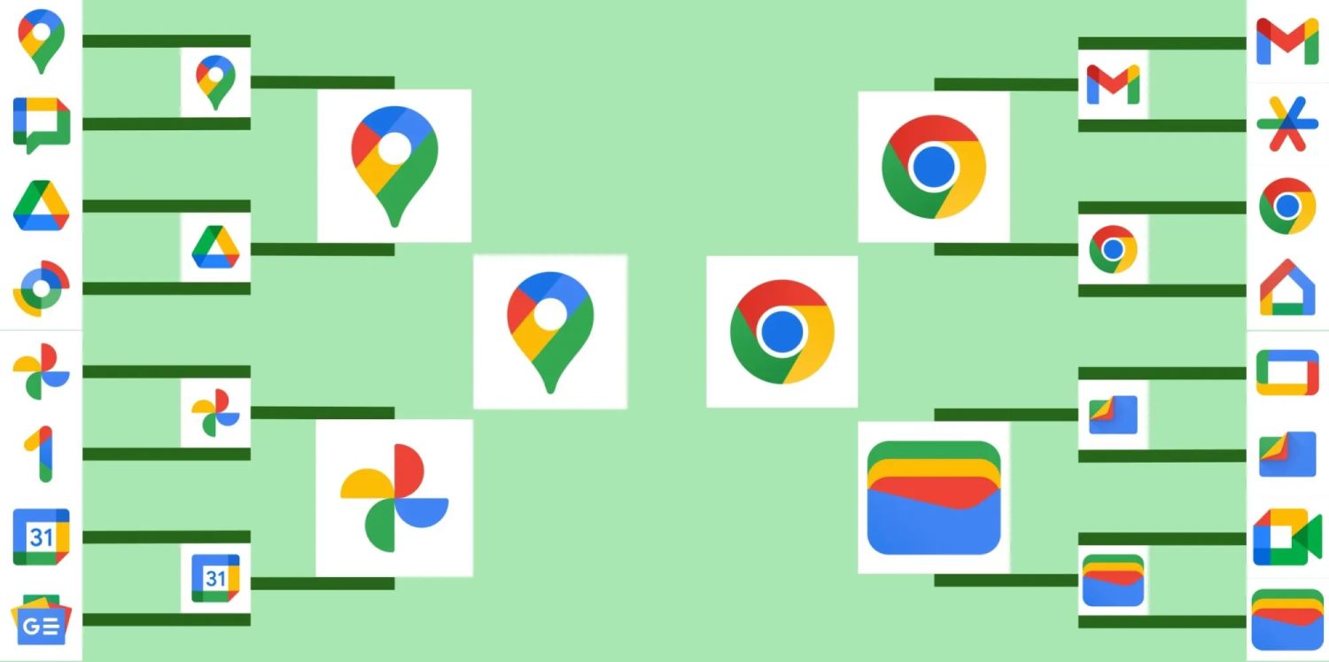 In obiger Grafik seht ihr den Verlauf der Abstimmungen. Es traten immer zwei Apps gegeneinander an, wobei der Sieger in die nächste Runde kam und gegen einen anderen Sieger antrat. Klassisches System wie bei der Fußball-Weltmeisterschaft. Auf seinem Weg zur Spitze hat Chrome das Wallet-Icon geschlagen, das GMail-Icon sowie das Google Home-icon. Google Maps hat auf dem Weg zum Vizetitel die Apps Google Fotos, Google Drive sowie Google Chat hinter sich gelassen.