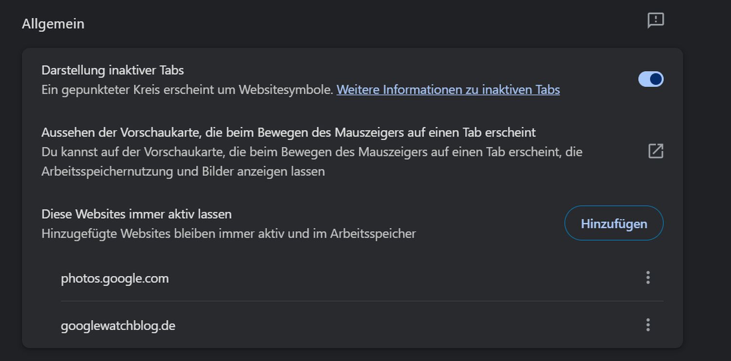 Der wichtigste Schritt für einen dauerhaften Erfolg führt euch in die Einstellungen. Denn Google Chrome sorgt im Zuge der Leistungssteigerung dafür, dass längere Zeit nicht genutzte Tabs inaktiv geschaltet werden. Ein gewünschtes Verhalten, das für unser Vorhaben aber Gift ist und dazu führen würde, dass Google Fotos schon nach wenigen Stunden keine Ordner mehr überwachen, geschweige denn Uploads durchführen kann. Wir müssen eine Ausnahme für Google Fotos erstellen.