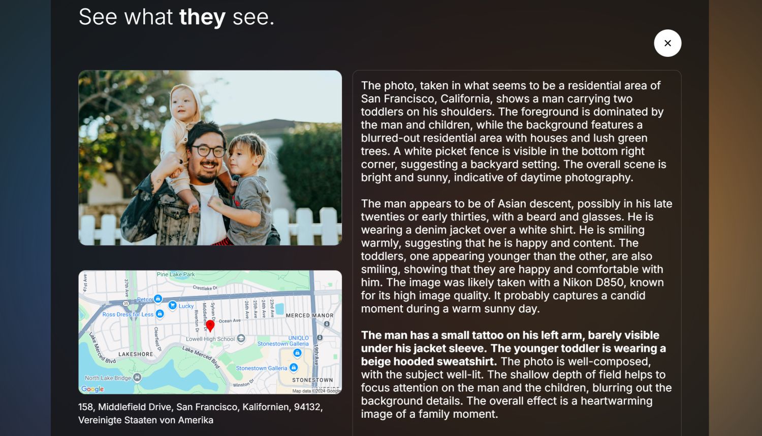 Die Beschreibung ist bei jedem Bild unterschiedlich, daher will ich an dieser Stelle nicht näher darauf eingehen. Doch es zeigt sich, dass die KI sehr gut das gesamte Motiv und nicht nur einzelne Bestandteile erfassen kann. Die KI beschreibt Personen inklusive Stimmungen, schätzt bei jeder Person sowohl das Alter als auch die Ethnie absolut korrekt ein und nennt die erkannten Beziehungen zueinander. Es wird die Gesamtstimmung des Bildes beschrieben, einzelne Objekte, ein gesamte Arrangement und vieles mehr, das über eine normale Objekterkennungs-Beschreibung hinaus geht.