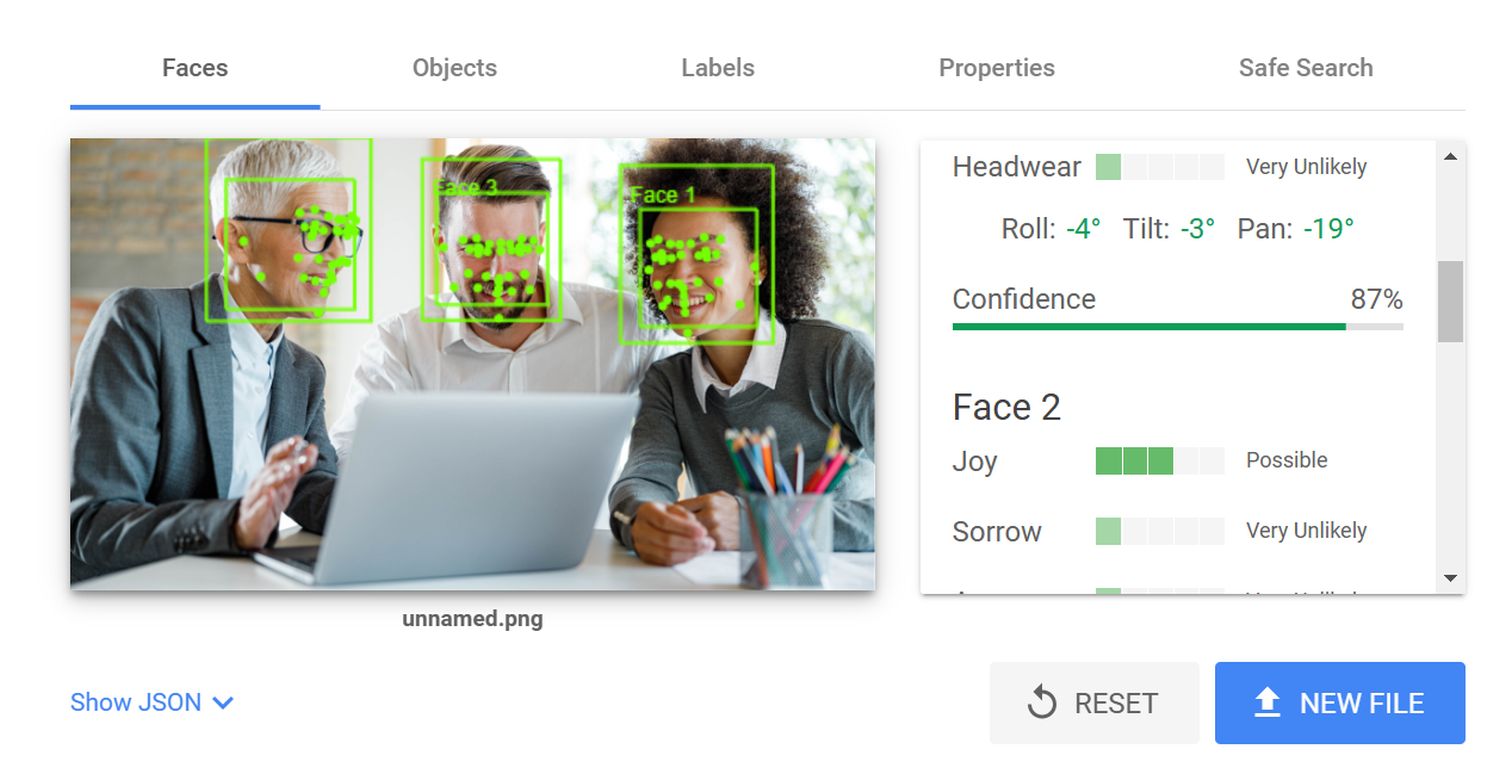 Die Algorithmen erkennen alle Gesichter auf einem Bild, das ist keine große Sache mehr. Die Cloud Vision API gibt außerdem den Gesichtsausdruck bzw. die visuell erkannte Gefühlslage an: Glücklich, traurig, aufgeregt, überrascht und mehr. Aber auch ein verpixeltes Gesicht oder eine Kopfbedeckung wird erkannt. Zusätzlich gibt es die Information über die Kopfhaltung: Neigung, Blickrichtung und Rollen.