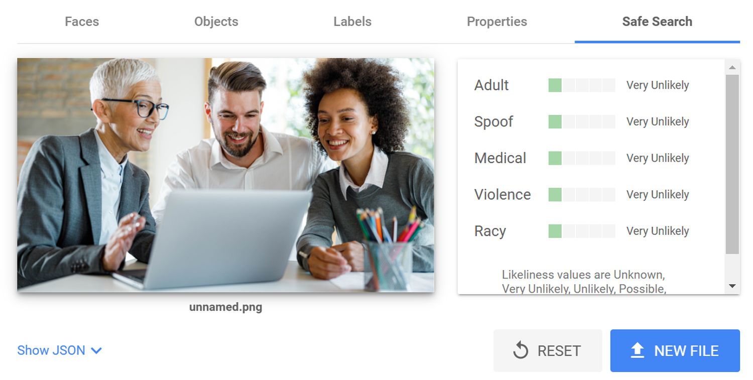 Eine praktische Angabe für einen schnellen Check von Fotos, die von anderen Nutzern hochgeladen und veröffentlicht werden sollen. Die API versucht zu erkennen, ob es sich um einen Erwachseneninhalt handelt, um eine Parodie, eine medizinische Darstellung, Betrug oder Rassismus. Für alle Einstufungen gibt es mehrere Schritte sowie eine Prozentangabe der Wahrscheinlichkeit.