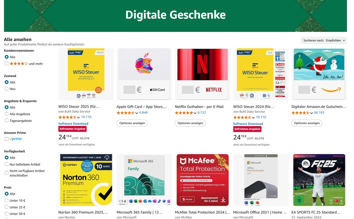 Bei Amazon findet ihr jetzt viele Digitale Geschenke und Gutscheine, die spontan gekauft und eingesetzt werden können. Schaut da einfach mal vorbei, ob ihr den zu Beschenkenden eine Freude machen könnt. Es gibt Netflix-Gutscheine, Microsoft-Gutscheine, Guthabenkarten für den Apple App Store oder auch die beliebten Amazon-Geschenkgutscheine. Aber auch digitale Abos für NordVPN oder gar Steuererklärungs-Software in Aktion sind gelistet.