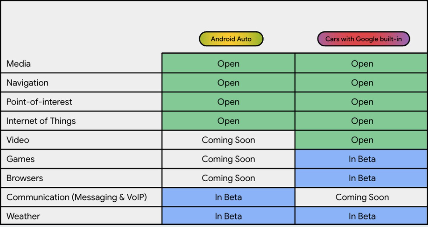 Vor einigen Monaten wurde die Öffnung der Plattform für weitere Apps angekündigt, was sowohl für Android Auto als auch den großen Bruder Android Automotive gilt. Neu dazustoße werden Apps aus Kategorien, die mutmaßlich während der Fahrt niemals nutzbar sein werden – zumindest nicht für den Fahrer. In der folgenden Infografik findet ihr die Kategorienliste mit ihrem aktuellen Stand und den geplanten Neuzugängen.