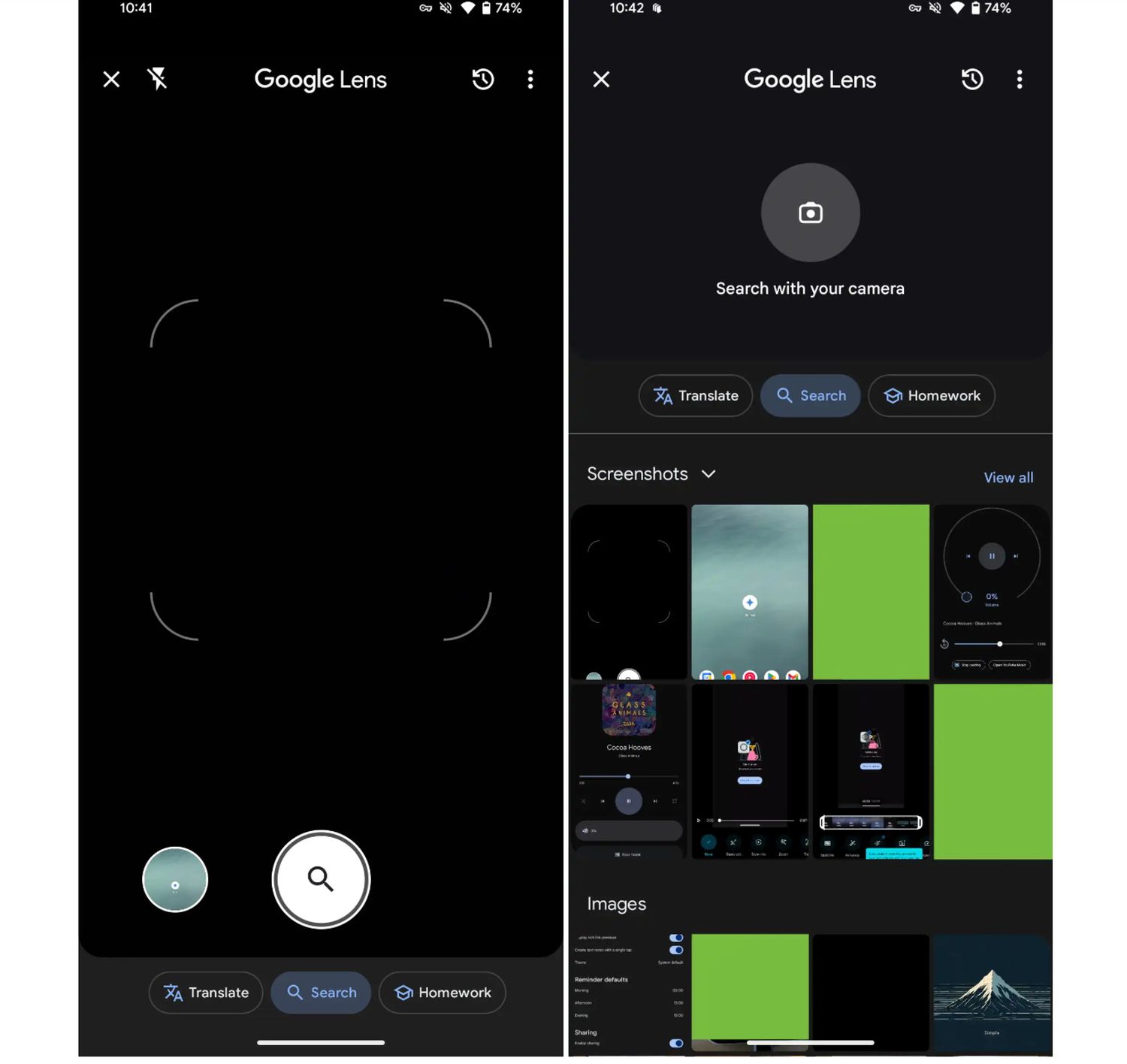 Um ein Bild auszuwerten, haben die Nutzer bei Google Lens zwei Möglichkeiten: Entweder sie wählen ein Bild aus der Galerie oder sie fertigen mit der Kamera ein neues Foto an, das sofort nach der Aufnahme ausgewertet wird. Beim Start der App vor vielen Jahren war die Galerie der Standard und die Kamera musste separat aufgerufen werden. Später setzte man auf eine Doppellösung mit geteiltem Display, wobei im oberen Teil das Kamerabild und in den untern zwei Dritteln die Galerie gezeigt wird. Praktisch, aber eigentlich sehr kurios mit dem Gefühl eine Bastellösung.