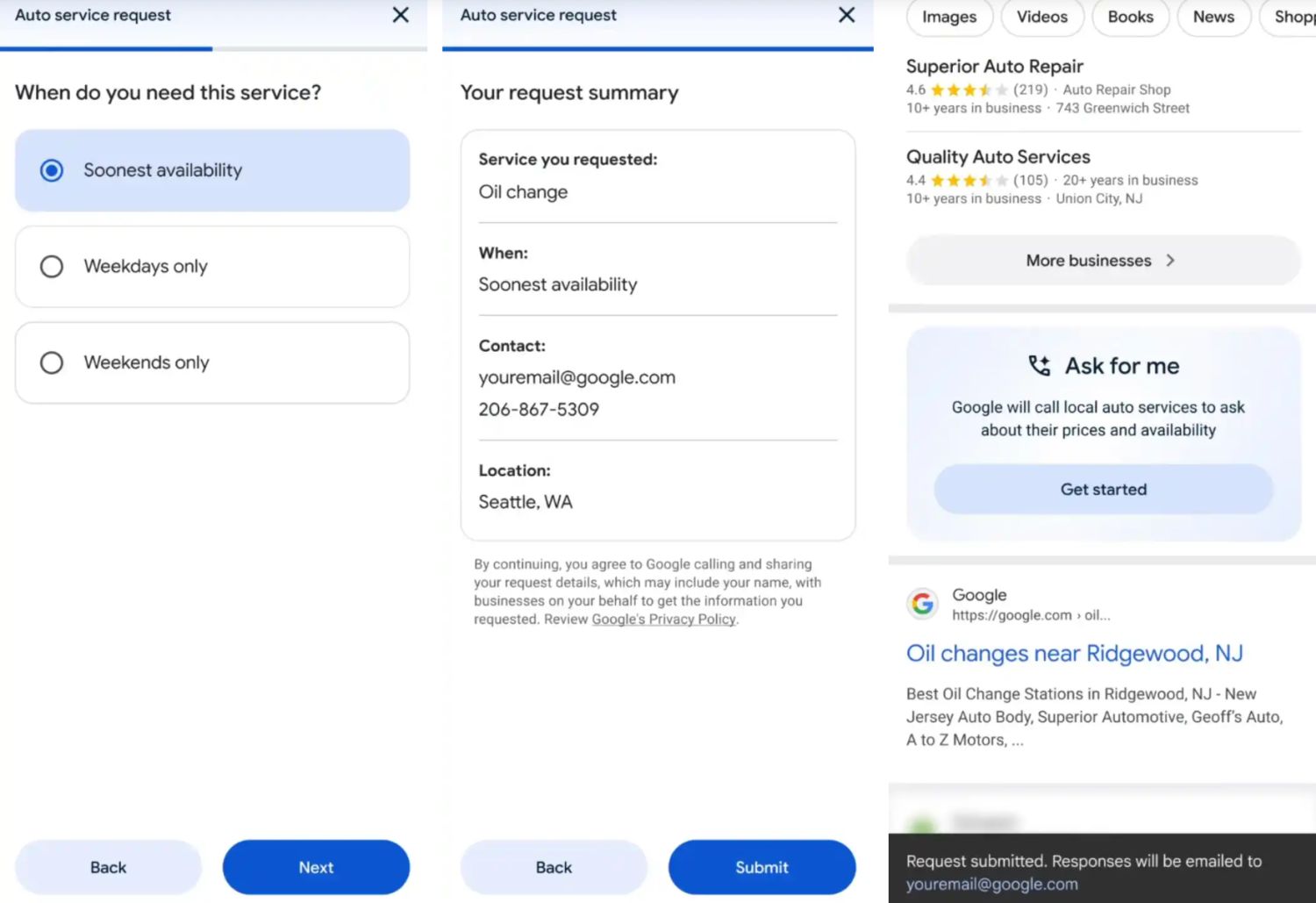 Hinter dieser Funktion steckt die Google Duplex-KI, die schon seit Jahren Telefongespräche führen und Informationen sammeln kann. Diese ruft bei den jeweiligen Unternehmen an und fragt nach den vom Nutzer gewünschten Details. Auf den Screenshots hier im Artikel seht ihr das am Beispiel einer Autowerkstatt, bei der die KI nach Angabe einiger Informationen nach Preisen und freien Terminen fragt. Ähnliches gibt es im Testlauf auch für Kosmetikstudios.