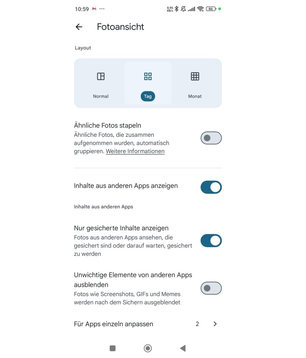 Ihr könnt festlegen, dass „unwichtige Inhalte“ aus anderen Apps ausgeblendet werden, während weitere Medien weiter gezeigt werden. Möchtet ihr etwa eure per WhatsApp empfangenen Fotos im Fotostream sehen, aber die lustigen Memes, GIF-Animationen oder Screenshots hingegen nicht, ist das mit diesem aktiven Filter möglich. Die Einstufung des Fototyps nehmen die Google Fotos-Algorithmen selbst vor, was meist zuverlässig funktioniert. Reicht euch auch das nicht, gibt es einen App-Filter, mit dem ihr für jede einzelne App festlegen könnt, ob deren Medien erscheinen sollen oder nicht.