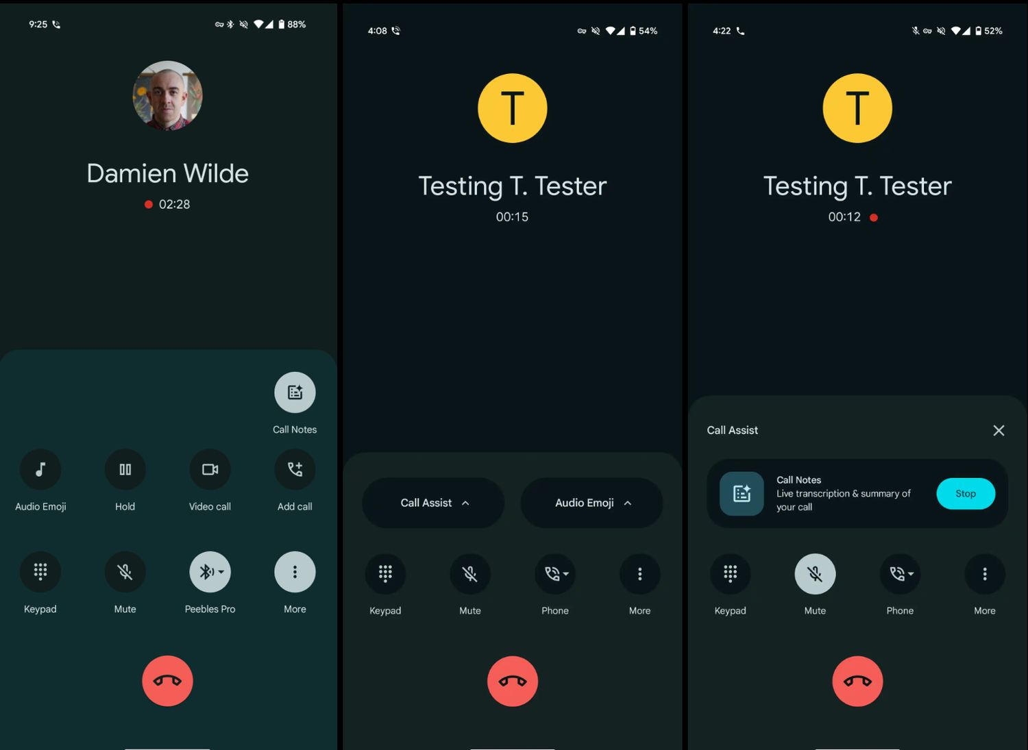 Jetzt hat das Google Telefon-Team eine Änderung angekündigt, mit der diese Funktion noch einfacher als bisher zugänglich sein soll. Dafür wird es eine veränderte Button-Anordnung in der Telefon-App geben, so wie ihr das auf obigem mittleren und rechten Screenshot sehen könnt. Die Standardfunktionen bleiben im unteren Teil und die beiden KI-Funktionen für die Anruf-Assistenz sowie die Audio Emojis haben nun große Buttons im oberen Teil. Ein Tap auf Call Assistant gibt zudem die Möglichkeit, die Aufzeichnung für Call Notes zu stoppen.