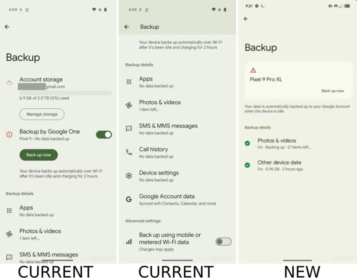 Schon bald erhält das Android-Backup ein größeres Update, das sich jetzt in Form einer neuen Oberfläche auf ersten Screenshots zeigt. Wie ihr auf dem linken und mittleren Screenshot sehen könnt, kann die Android-interne Backup-Funktion viele Details auflisten und darüber informieren, welche Daten gesichert sind: Apps, Fotos & Videos, SMS & MMS, der Anrufverlauf, die Smartphone-Einstellungen sowie die Informationen zum Google-Konto. In der neuen Oberfläche wird all das sehr kompakt zusammengefasst. Ihr könnt es auf dem rechten Screenshot sehen.