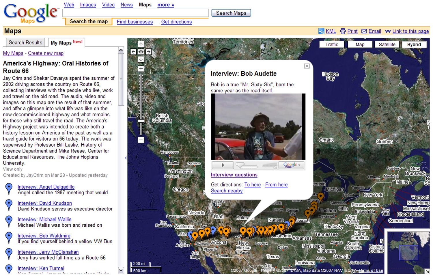 Das einzige Foto von Google Maps aus dem Jahr 2007. Damals kam die Satellitenansicht ganz frisch dazu, die nicht von Anfang an zur Verfügung stand. Auch hier gab es schon die Suchleiste am linken Rand, wenn auch in anderer Form. Außerdem wurden die Marker eingeführt, die Fotos auf der Karte, die Sprechblasen für Ortsdetails und es gab sogar Videos von Google Video innerhalb der Karte. Ganz neu war damals My Maps, mit dem eigene Karten erstellt werden konnten. Das ist auch heute noch möglich, aber längst viel besser versteckt.