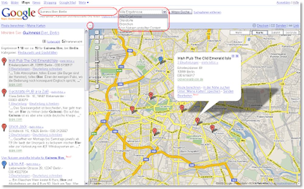 Damals war die Kartenplattform schon drei Jahre alt, aber grundsätzlich ist es das Design, mit dem alles begonnen hat. Damals war die Karte zwar ebenfalls schon sehr groß dargestellt, aber nur ein Teil der Oberfläche. Die bildschirmfüllende Ansicht mit schwebenden Elementen kam erst sehr viel später. Wie ihr sehen könnt, befand sich die Hauptnavigation am oberen Rand und ermöglichte den Wechsel zwischen Suchergebnissen und Karte sowie mit mehreren Suchfeldern die Suche nach Orten, Branchen oder Routen. Erst später kam die Vereinheitlichung auf ein einzelnes Suchfeld.