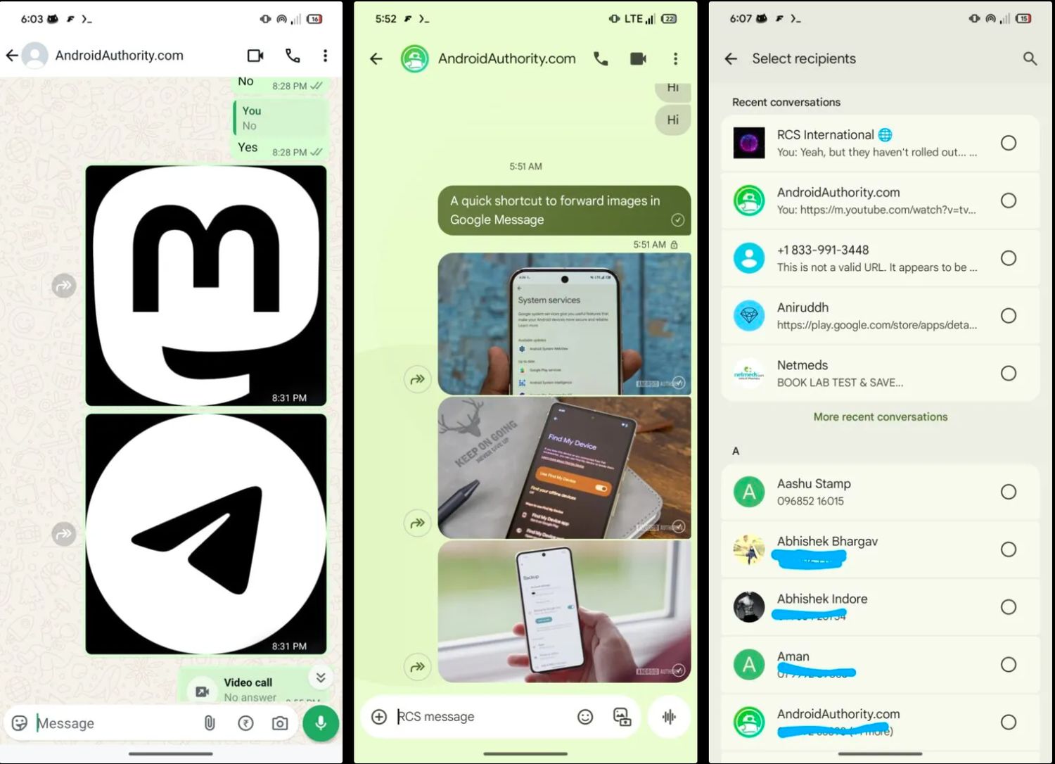 Auf obigen Screenshots könnt ihr in der Mitte den neuen Weiterleiten-Pfeil neben der Nachricht sehen. Links daneben zum Vergleich die WhatsApp-Umsetzung. So wie beim großen Messenger-Konkurrenten soll ein Tap auf den Button die Liste der Kontakte öffnen, aus der der oder die Empfänger ausgewählt werden können. Die Weiterleitung sollte dann nach demselben Prinzip ablaufen wie das bisher der Fall gewesen ist, denn natürlich hatte Messages auch schon zuvor eine solche Funktion.