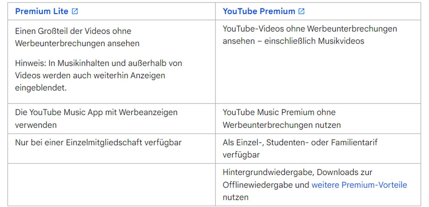 Die Notwendigkeit des Premium Lite-Abos hat sich daraus ergeben, dass das Standard-Abo mit 12,99 Euro pro Monat vielleicht über die Schmerzgrenze einiger Nutzer hinausgegangen ist, die die weiteren Vorteile wie etwa den vollen Zugang zu YouTube Music gar nicht benötigen. Zwar ist die Kombination aus werbefreiem YouTube und kostenlosem Musikstreaming im Vergleich unschlagbar günstig, aber wer lieber an anderer Stelle streamt, benötigt das eben nicht. Aber es gibt noch weitere Unterschiede.