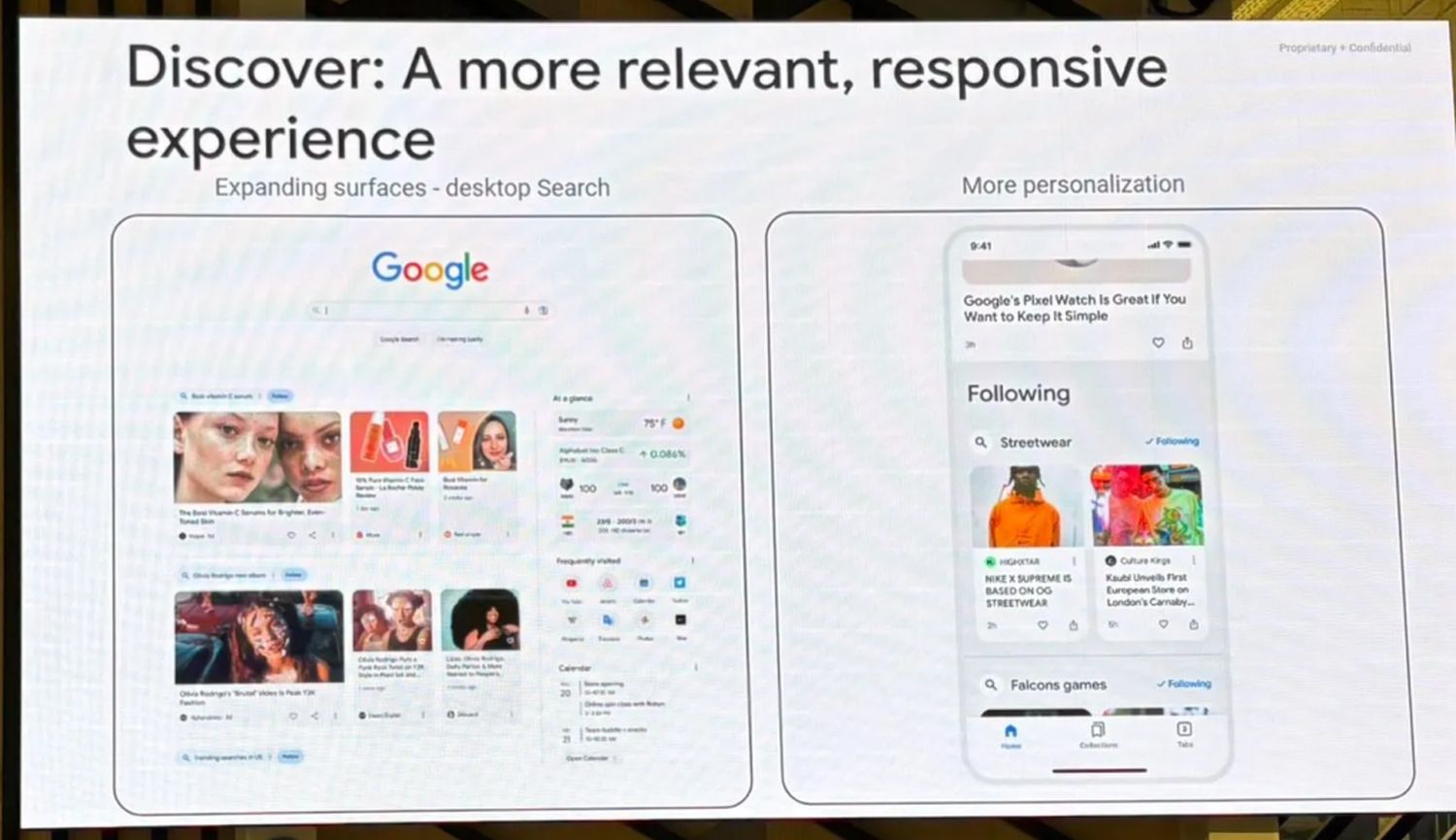 In der Präsentation ging es darum, die Reichweite des Discover Feeds zu erweitern und den Nutzern noch mehr personalisierte Inhalte zu liefern. Am Smartphone dürfte man die Grenze durch den nullten Homescreen, die mobile Google-Startseite sowie die ‚Neuer Tab‘-Seite im Chrome-Browser bereits erreicht haben. Außerdem ist die Rede von „responsive“ – also für größere Displays, die noch über die Abmessungen eines Tablets hinausgehen.