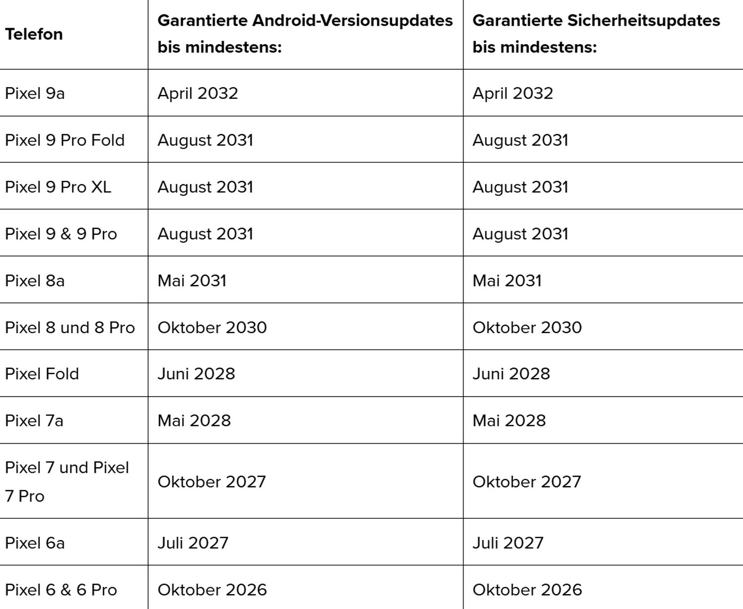 Die Pixel 9-Smartphones sind noch die aktuellen Smartphones und werden bis August 2031 rundum mit Updates versorgt. Ein unglaublich langer Zeitraum, der allen Käufern praktisch eine dauerhafte Sicherheit gibt – genau wie beim Pixel 9a. Bei aktuellem Tempo würden im August 2031 bereits die Pixel 16-Smartphones auf den Markt kommen. Nach diesen sieben Jahren wäre es dann ohnehin vielleicht an der Zeit für einen Tausch.