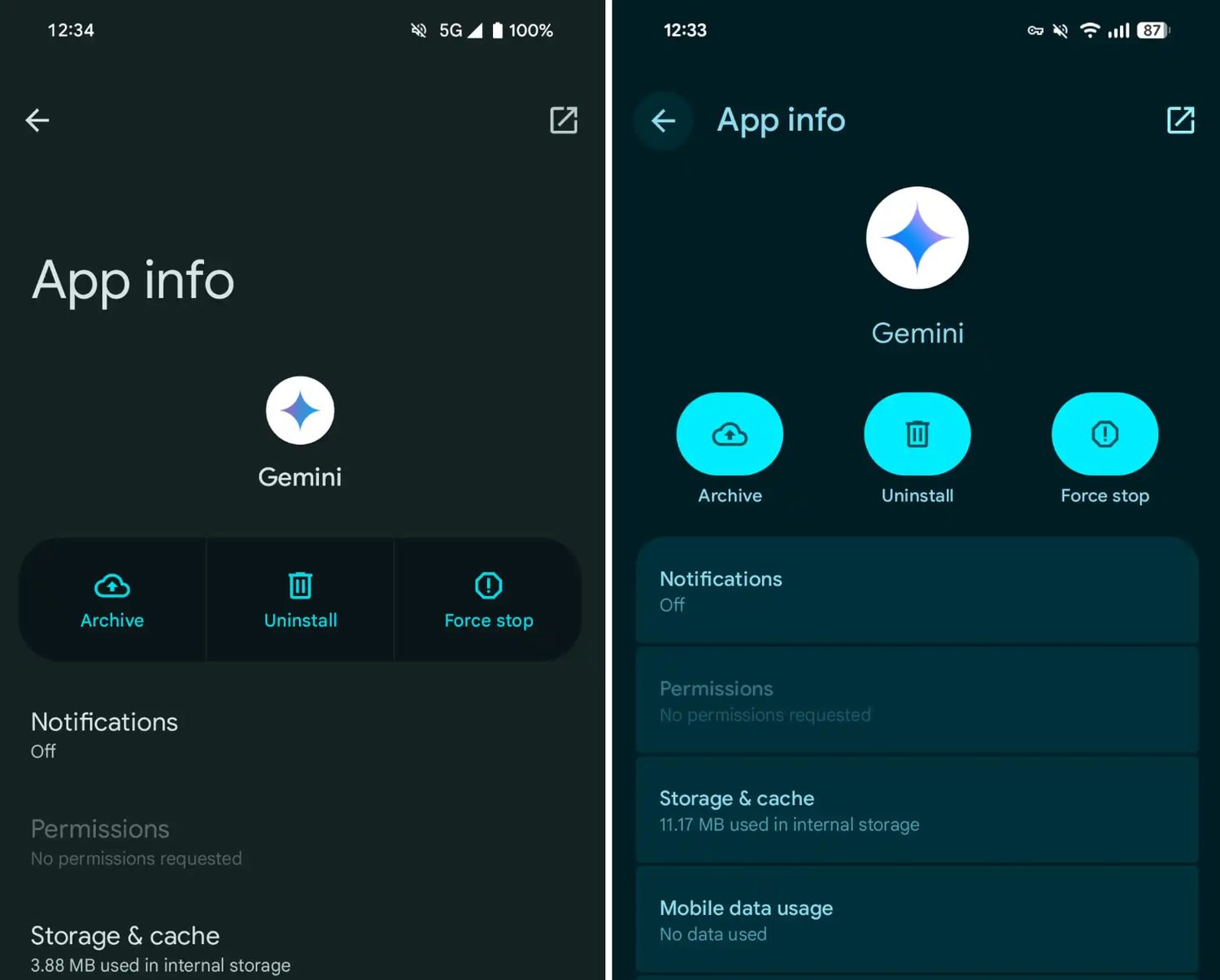 Die App-Info erhält ein neues Design, das ihr auf dem rechten Screenshot sehen könnt. Statt einer Aktionsleiste gibt es nun drei Buttons und statt unnötig viel Whitespace am oberen Rand ist das Design deutlich kompakter. Funktionell scheint sich nichts zu ändern.