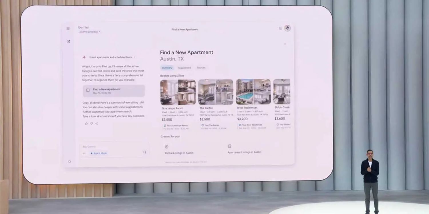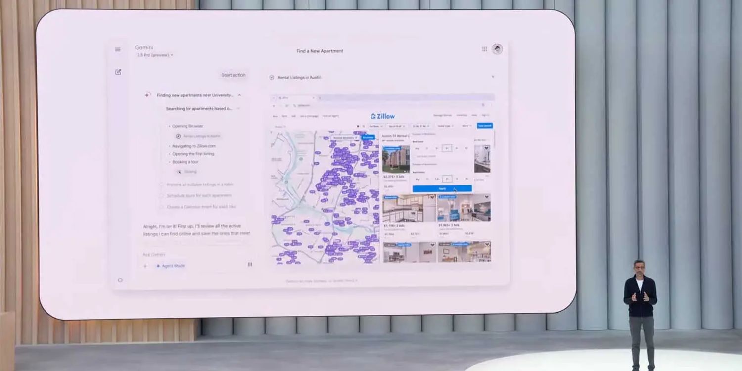 Die Nutzung von KI-ChatBots hat sich längst etabliert, basiert aber gewissermaßen weiterhin auf dem alten Frage-Antwort-Spiel. Auch wenn Produkte wie Gemini Live das ein wenig kaschieren, bleibt es bei diesem fixierten Ablauf: Nutzer fragt, KI antwortet. Mit den KI-Agenten bricht sich dieses Spielchen auf, denn die Nutzer können dauerhafte Aufgaben für Beobachtung, Funktionsausführung oder sonstige Reaktionen ausgeben. Als Beispiel zeigt man eine Wohnungssuche mit konkreten Anforderungen. Heute gibt es kein Ergebnis, aber vielleicht morgen oder nächste Woche. Die KI-Agenten überwachen dies und melden sich anschließend proaktiv. Ein wichtiger Bestandteil des neuen Gemini Agent Modus ist das Project Mariner.