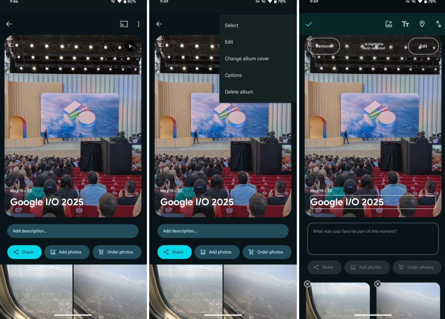 Wie ihr auf obigen Screenshots sehen könnt, wirkt die neue Oberfläche deutlich aufgeräumter und konzentriert sich zunächst darauf, den Nutzern möglichst viel von den eigentlichen Fotos zu zeigen. Es gibt weiterhin die Trennung zwischen Titelbild und einzelnen Bildern, dazwischen gibt es aber keine Elemente mehr. Die Möglichkeiten zum Teilen, Hinzufügen und Bearbeiten finden sich jetzt in einer schwebenden Navigationsleiste.