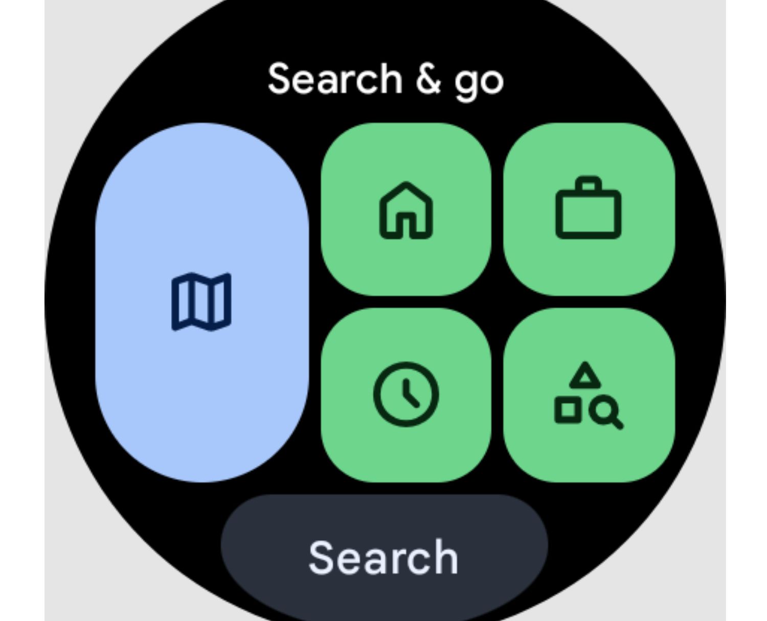 Auch auf der Kachel für die WearOS-Startseite tut sich etwas: Diese setzt auf sehr große und farbige Buttons. Dort zeigt sich ein vertikal sehr großer Button für die Kartenansicht, daneben die Schnellzugriffe für die Navigation nach Hause, zur Arbeit, zu den zuletzt aufgerufenen Orten sowie zu den Orten in der Nähe. Ausgerechnet die Suchfunktion hat es nicht in diesen Block geschafft und zeigt sich mit einem eher unscheinbaren Button am Ende der Liste.