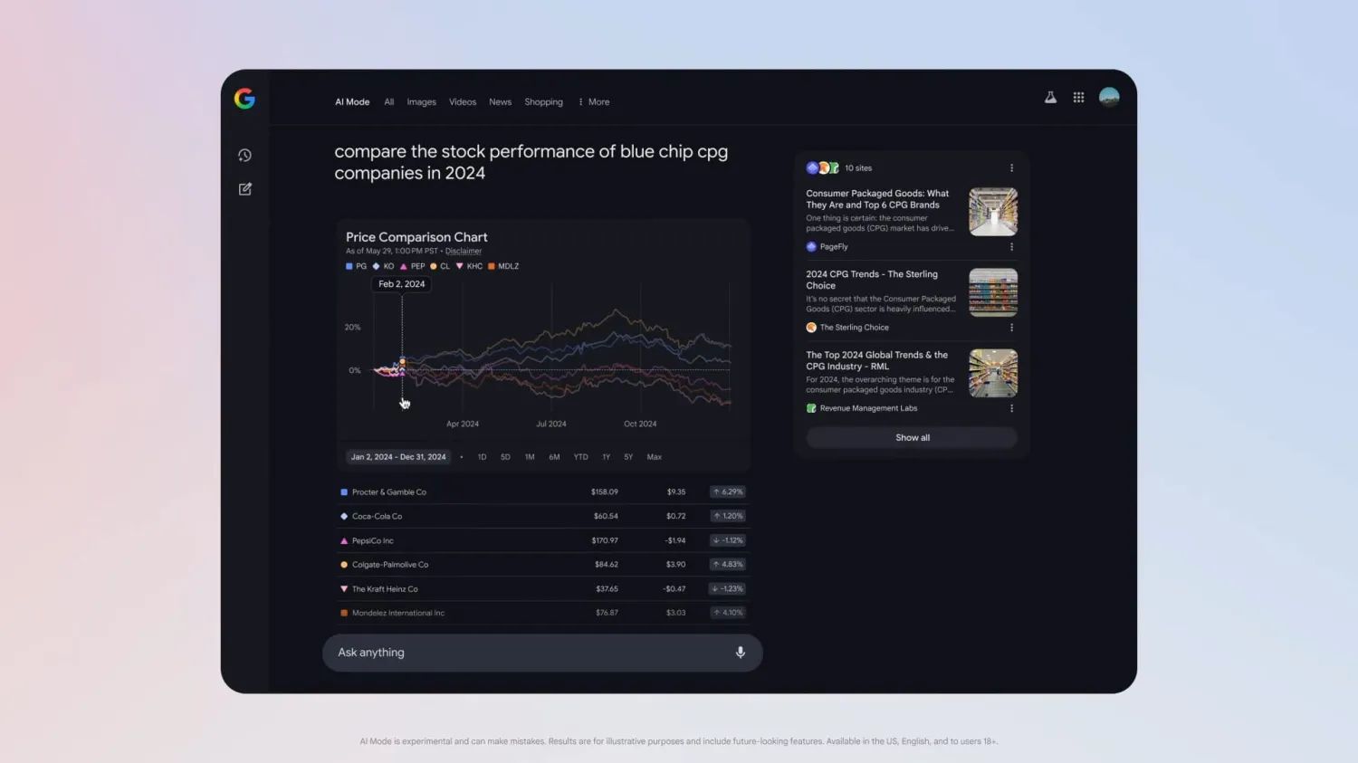 Vergleichen Sie die Aktienperformance von Blue-Chip-Unternehmen im Konsumgüterbereich im Jahr 2024. Anstatt einzelne Unternehmen und deren Aktienkurse manuell zu recherchieren, übernimmt der KI-Modus die Arbeit für Sie. Er nutzt dafür die fortschrittlichen mehrstufigen Argumentations- und multimodalen Funktionen von Gemini. Und wenn Sie noch eine Folgefrage stellen, wie etwa: „Hat eines dieser Unternehmen Dividenden ausgezahlt?“, erkennt der KI-Modus, was für Sie zu recherchieren ist.