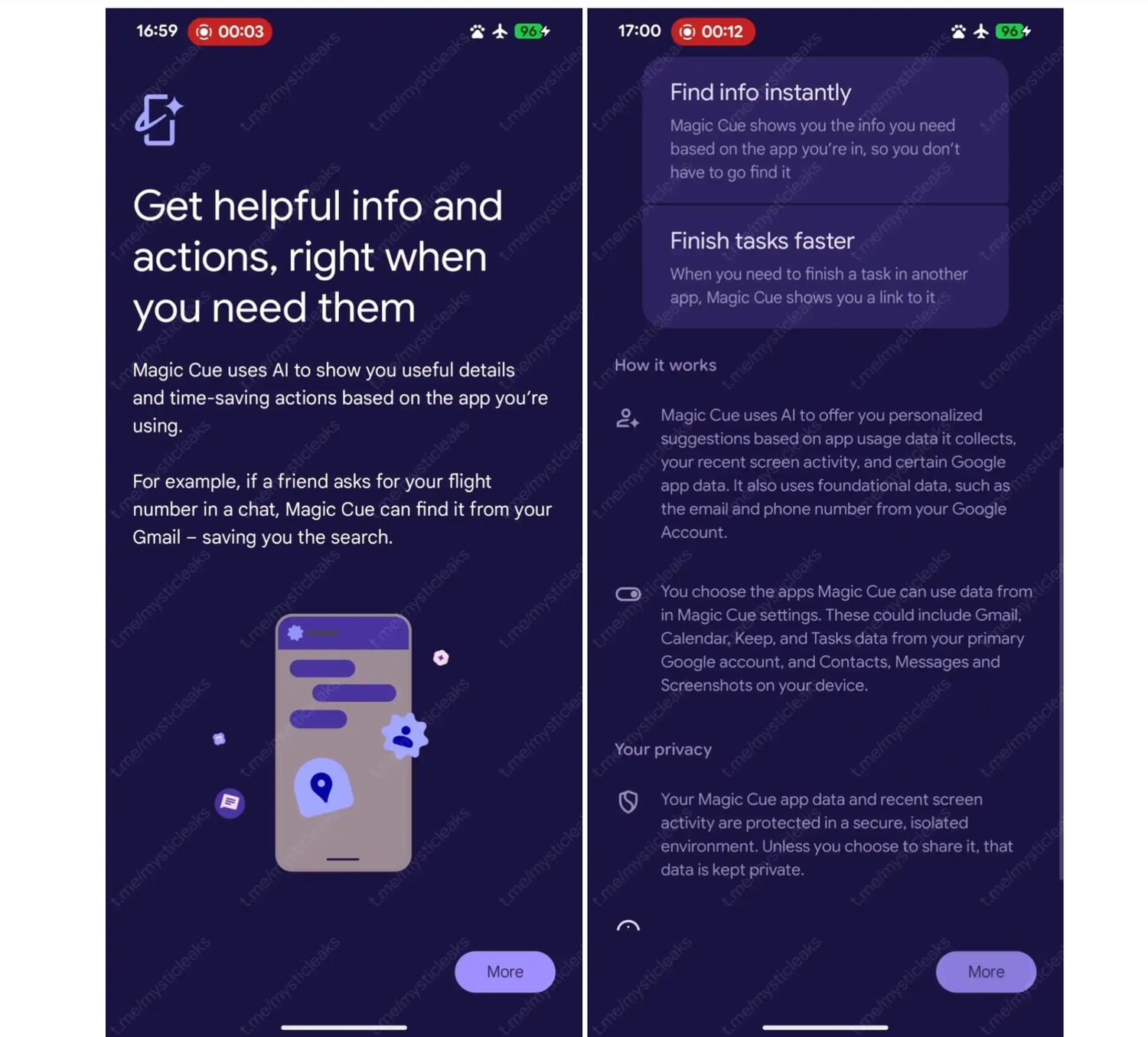 Bei Magic Cue handelt es sich um eine KI-Infrastruktur, die laut der Beschreibung immer dann nützliche Details und sinnvolle Funktionen bieten soll, wenn der Nutzer sie benötigt. Als Beispiel gibt man an, dass die sofort die Flugnummer aus Flugtickets auslesen kann, wenn ein Freund danach fragt. Also folgender Ablauf: Der Freund fragt nach der Flugnummer für den bevorstehen Flug, Gemini erkennt dies, sucht in GMail nach dem Ticket und liefert die gewünschte Information als Schnellzugriff.