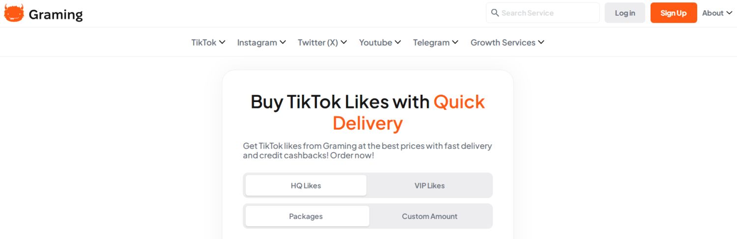 Graming ist ein vielseitiger Dienstleister für den Kauf von Likes mit flexiblen Tarifen und einem breiten Serviceangebot. Die Plattform ist nicht ausschließlich auf TikTok spezialisiert, sondern deckt mehrere soziale Netzwerke ab.