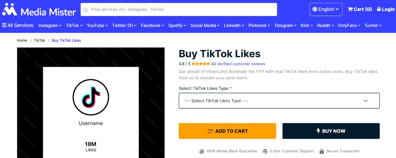 Das Hauptmerkmal dieses Anbieters sind personalisierte Lösungen für Kunden. Die Website bietet eine breite Palette von Dienstleistungen im Zusammenhang mit verschiedenen sozialen Netzwerken. Daher eignet sich die Plattform besonders für Blogger, die sich auf Transmedia und Multi-Accounting spezialisiert haben. Neben TikTok arbeitet Media Mister mit den folgenden Plattformen zusammen: Instagram, YouTube, Twitter, Spotify, LinkedIn und Facebook.