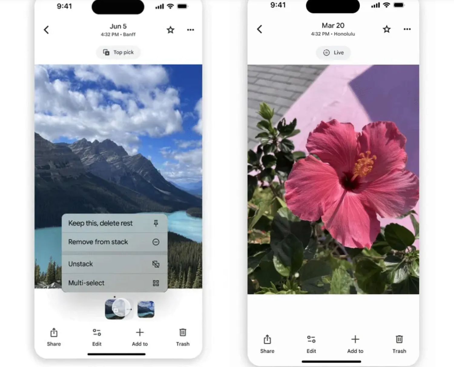 Zusätzlich kann es am oberen Rand eine Reihe von Badges mit Informationen und Funktionen geben. Diese werden nur bei Bedarf gezeigt und ermöglichen das Ändern der Kategorien, das Pausieren eines animierten Fotos, das Speichern eines geteilten Fotos und ähnliche Dinge. Am unteren Rand kann es zwischen dem Foto und den Funktionen außerdem eine Reihe von ähnlichen Bildern aus dem Fotostapel geben. Zu diesen lässt sich schnell wechseln und auch die Auswahl anpassen.