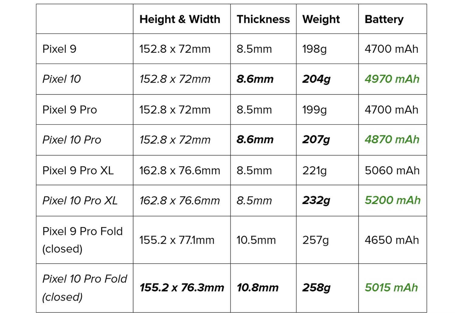 Aktuelle Leaks zu den Abmessungen der Smartphones lassen vermuten, dass die Magneten in allen vier Geräten verbaut sein werden. Dass es auch Google-Schutzhüllen mit Magneten geben soll, will nicht ganz dazu passen, ist aber dennoch auch beim Vorbild Apple nicht ungewöhnlich. Wie ihr obiger Tabelle entnehmen könnt, legen alle Smartphones in der Größe und auch beim Gewicht zu. Das könnte den ebenfalls in allen Modellen gewachsenen Akkus geschuldet sein, aber die Magneten sind ebenso wahrscheinlich.