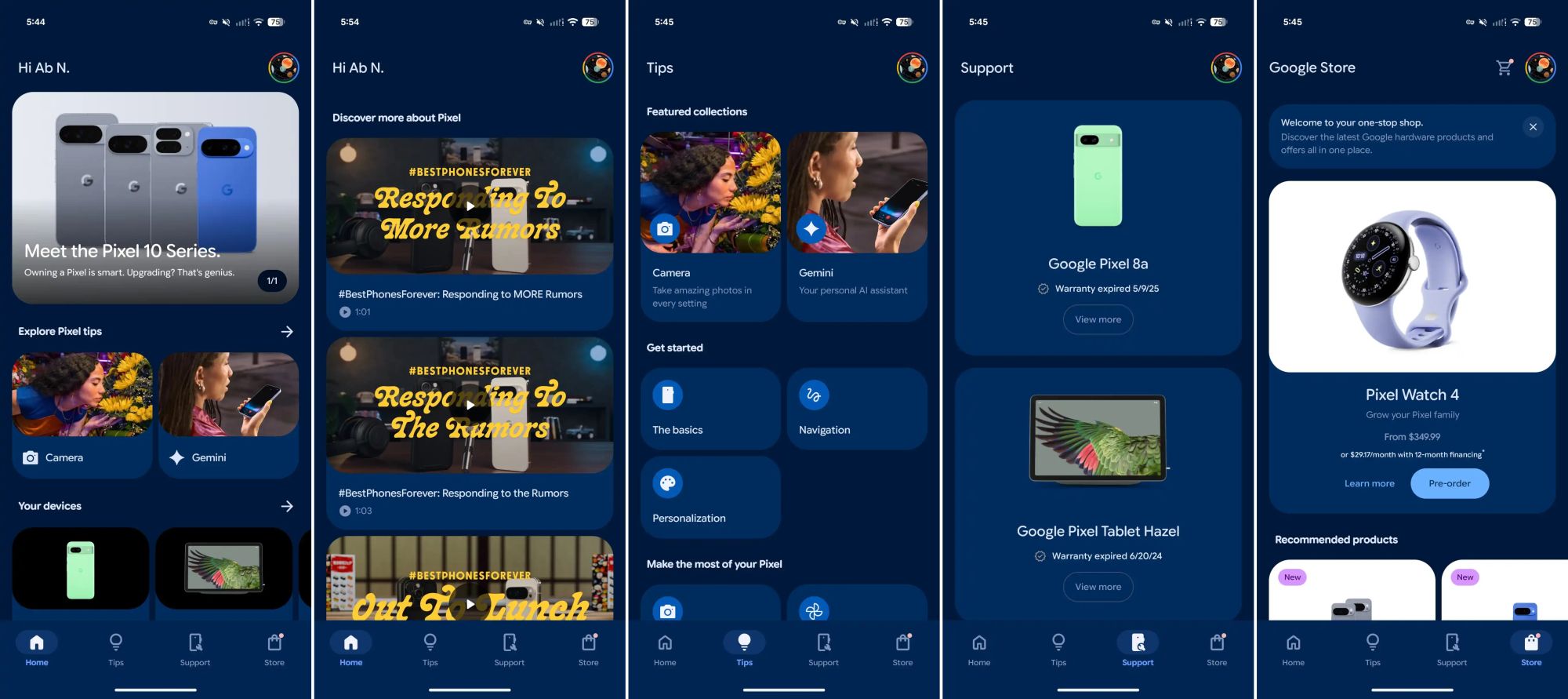Im vierten Tab findet sich eine abgespeckte Version des Google Store, sodass innerhalb der App auch neue Pixel-Geräte erworben werden können. Das kann ein neues Smartphone sein, aber auch eine Smartwatch, Kopfhörer oder andere Produkte. Gut möglich, dass sich darin zukünftig exklusive Rabatte verstecken, die man treuen Nutzern anbieten möchte. Auf den folgenden Screenshots könnt ihr die App-Oberfläche sehen.