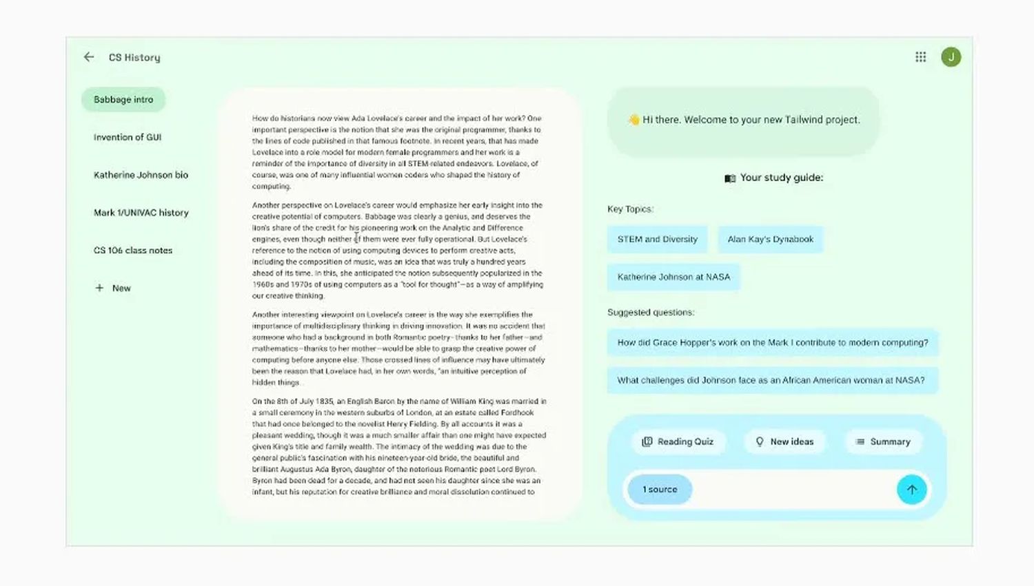 Die Entwicklung von NotebookLM hat erst Mitte 2022 begonnen, als ein kleines Team innerhalb von Google Labs eine einfache Idee hatte: Eine App, die die Stärken der neuen KI-Modelle dafür verwendet, große Informationsmengen auszuwerten und den Nutzern bei Research, Brainstorming und Faktensuche zur Seite steht. Angekündigt wurde es schon ein halbes Jahr später erstmals als Project Tailwind – wir hatten hier im Blog darüber berichtet.